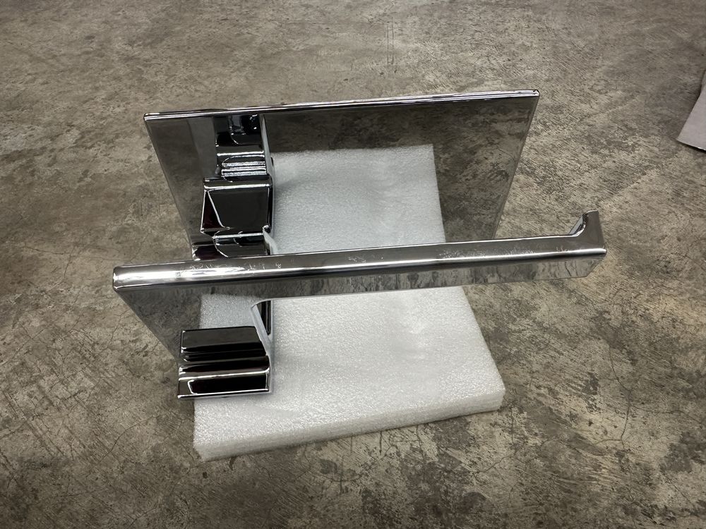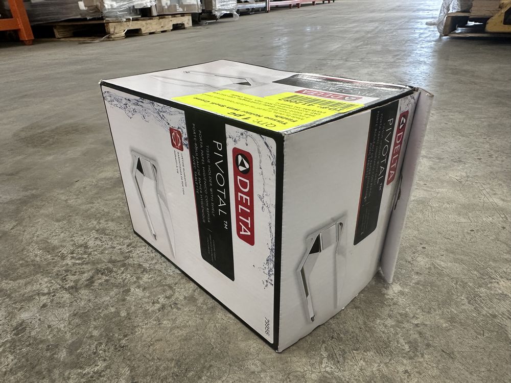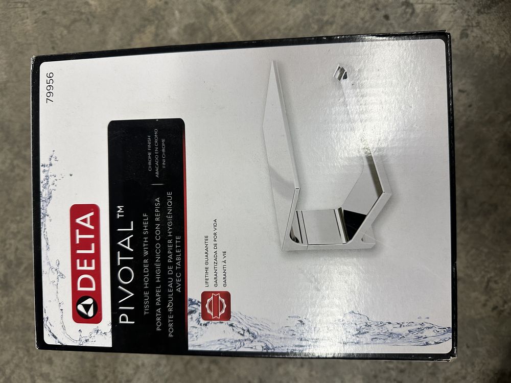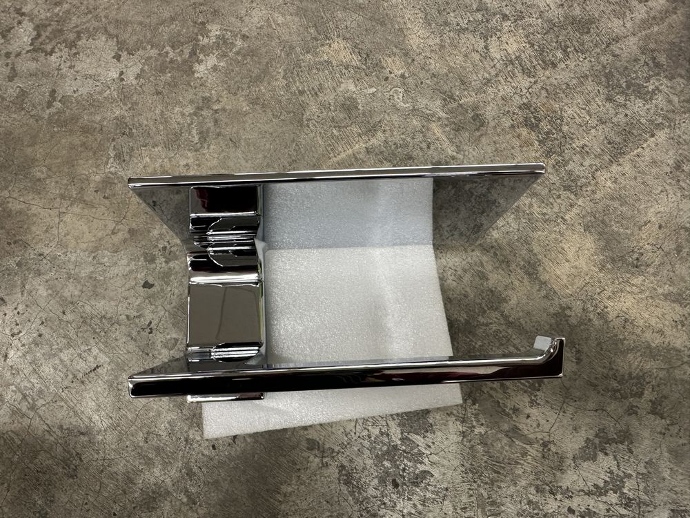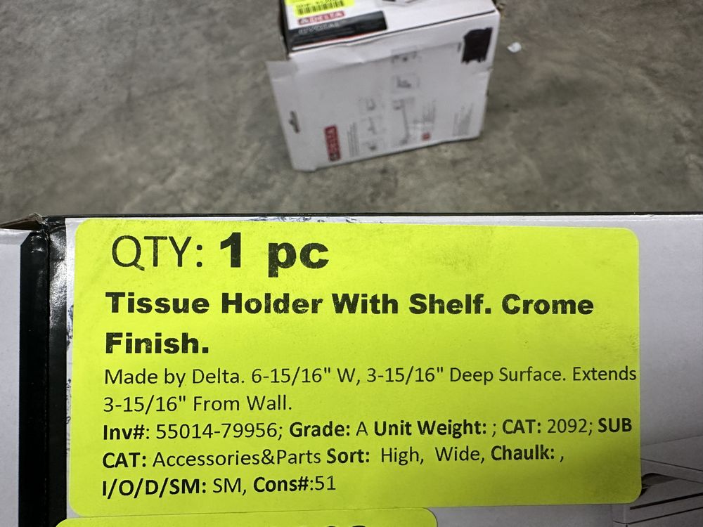 Tissue Holder With Shelf. Chrome Finish. Made by Delta. 6-15/16" W, 3-15/16" Deep Surface. Extends 3-15/16" From Wall. Grade: A. Weight: x. Sold by: Piece. Sold as: Price X Quantity. Inventory #: 55014-79956