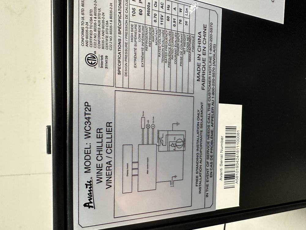 Avanti 20" 34 Bottle Freestanding Wine Cooler. Small scratch to right side, minor nicks to door frame. Refurbished. Model: WC34T2P. Weight: . Sold by: . Sold as: Price X Quantity. Inventory #: