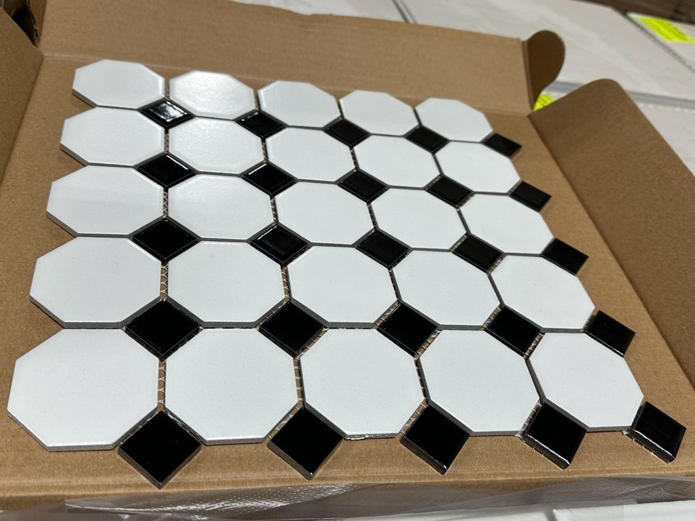 Elements, Black/White Matte Octagon & Dot Porcelain Mosaic Tile, 11 1/2"x11 1/2". By Lanka Tile, 10 sheets per box, 6 boxes in lot, 60 sheets total, Grade: Premium. Weight: 138. Sold by: Sheet. Sold as: Price X Quantity. Inventory #: 8512-ELMS BCWH 1226
