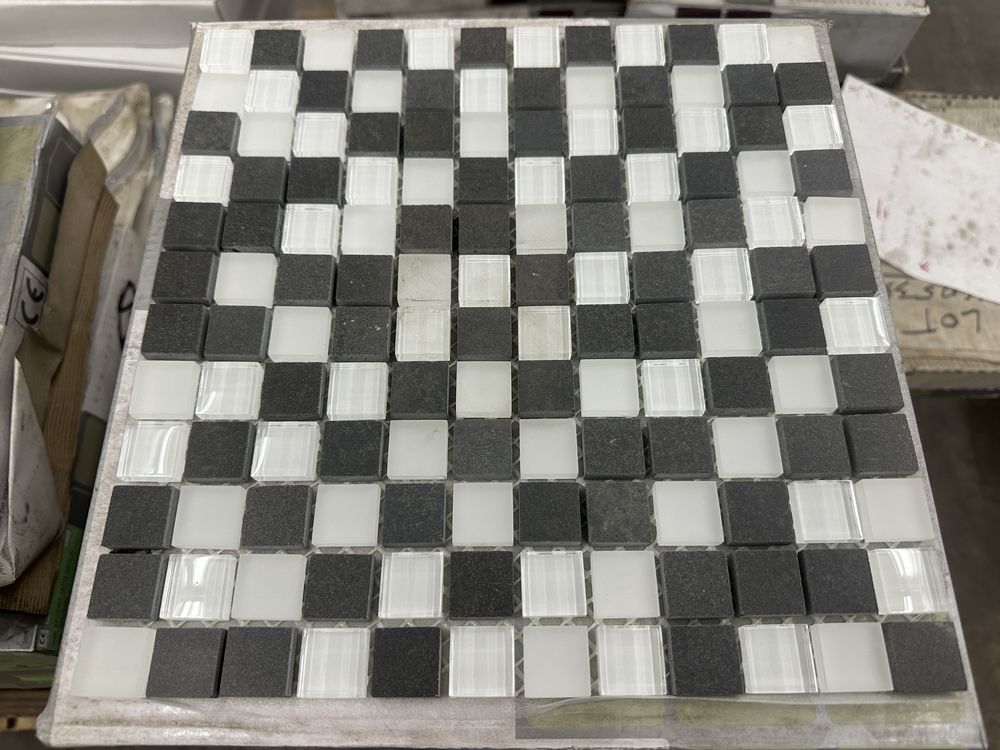 Charcoal, Clear and White Mosaic Tile 12"x12". Everstone, 11 sheets per box, 6 boxes total, Grade: A. . Weight: X. Sold by: Sheet. Sold as: Price X Quantity. Inventory #: 20404-MGS 100 1x1