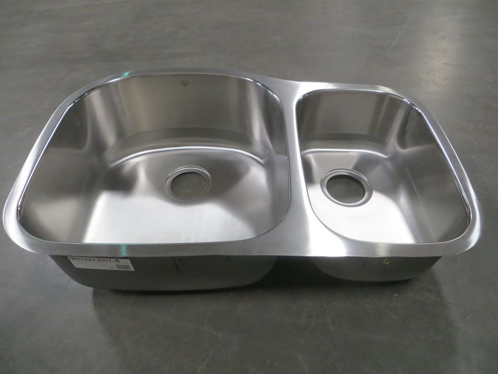 Stainless Steel Double Basin Sink, 31"x18 7/8"x7 1/4". By Artisan, Stainless Steel, Left Bowl: 18 7/8"x15 5/8"x7 1/4" Deep, Right Bowl: 17 3 Grade: A. Weight: 12. Sold by: Piece. Sold as: Price X Quantity. Inventory #: 5051-DBL Sink
