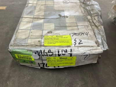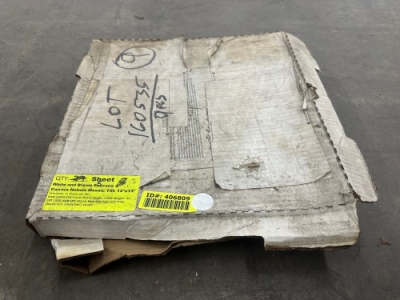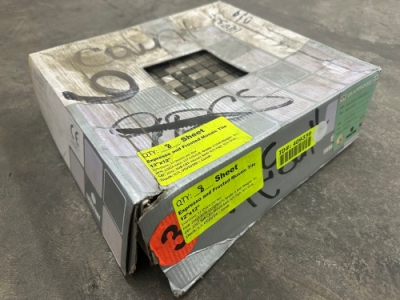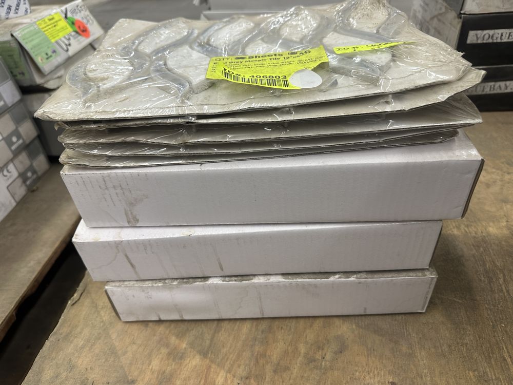 Charcoal, Clear and White Mosaic Tile 12"x12". Everstone, 1 box of 5 sheets, 1 box of 7 sheets, 2 box with 9 sheets, 1 box with 11 sheets, 5 boxes total, Grade: A. . Weight: X. Sold by: Sheet. Sold as: Price X Quantity. Inventory #: 20404-MGS 100 1x1