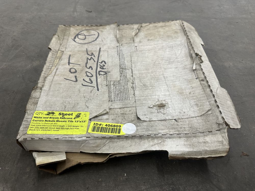 White and Brown Fuscana and Carrara Nebula Mosaic Tile 13"x13". Everstone, 1 box with 5 sheets, Grade: A. Weight: X. Sold by: Sheet. Sold as: Price X Quantity. Inventory #: 20404-MM-Fuscar-NEB-P
