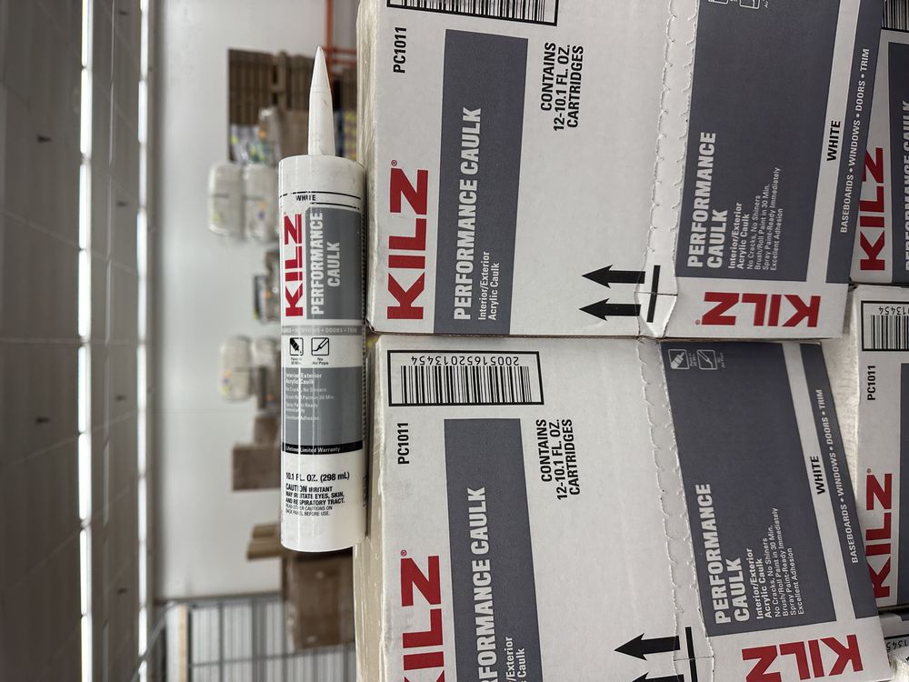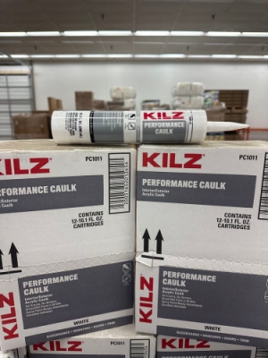 10.1 oz Interior/Exterior Performance Caulk. By Kilz, White no crack or shiners, paintable in 30 minutes. 2 cases, 12 tubes per case. Grade: A. Weight: 28. Sold by: Tube. Sold as: Price X Quantity. Inventory #: 6046-PC1011