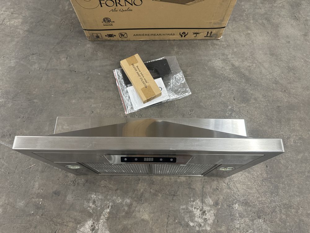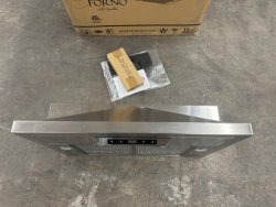 Forno Savona 30 in. Wall Mount Range Hood with Red Light Warmer Stainless Steel. Small dent to one filter. This 30 in. Wall Mount Range Hood by Forno offers a durable, all Stainless Steel design and offers 600 CFM of ventilation power. The hybrid filtration system reduce odor and maximize filtration efficiency. With versatile fan settings you can adjust the speeds based off your cooking needs. Duct Length (in) 6 Duct Width (in.) 6 Product Depth (in.) 25 in Product Height (in.) 22.6 in Product Width (in.) 29.53 in Range Hood Size (Width) 30 in. Weight: . Sold by: Piece. Sold as: Price X Quantity. Inventory #: