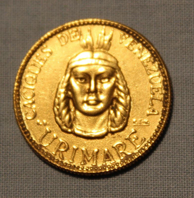 1957 Venezuela Chief Tamanaco 20 Bolivares gold coin.