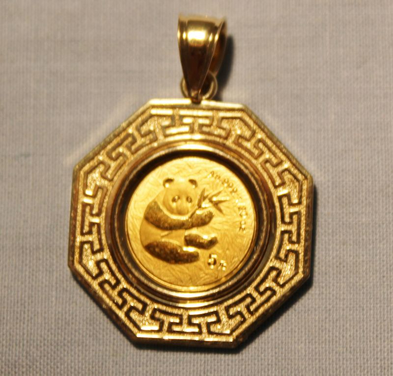 2002 China gold panda coin 1/20 ounce AU.999 5 Yuan mounted in a 14k gold pendant. Combined weight of coin and pendant is 4.57 grams.