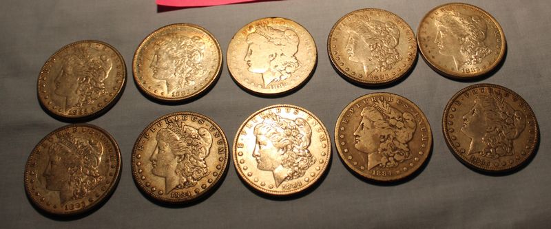 10 Morgan silver dollars including an 1882, 1882 O; 1882 S; 1883; 1883 O 1883 S; 1884 S; 1885.