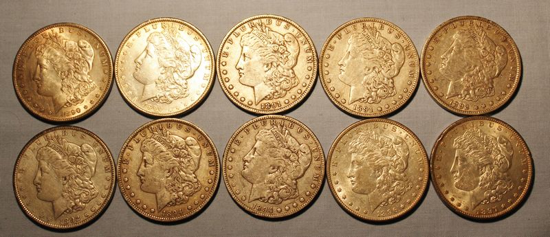 10 Morgan silver dollars including an 1890 S; 1890; 1891; 1891 O; 1892 O; 1892; 1894; 1894 O; 1896; 1897.