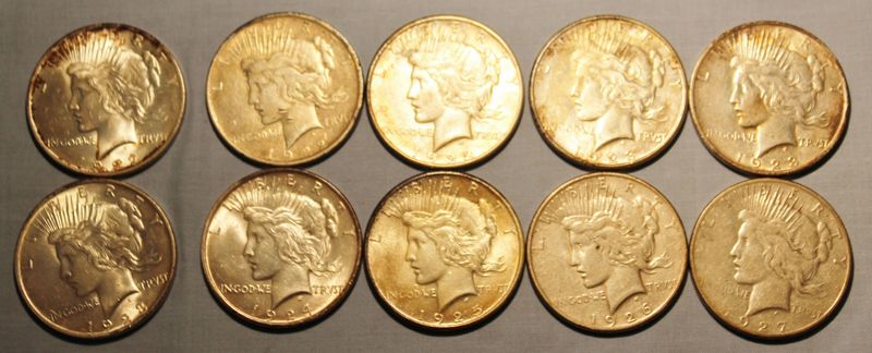 10 Peace silver dollars including a 1922; 1922 D; 1922 S; 1923 S; 1923 D; 1923; 1924; 1925; 1926 S; 1927 S.