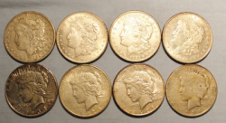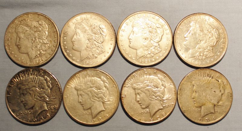 8 U.S. Silver dollars including 4 Morgans (1904; 1921; 1921 S; 1921 D) and 4 Peace dollars (1924 D: 1925 S; 1928 S; 1934).