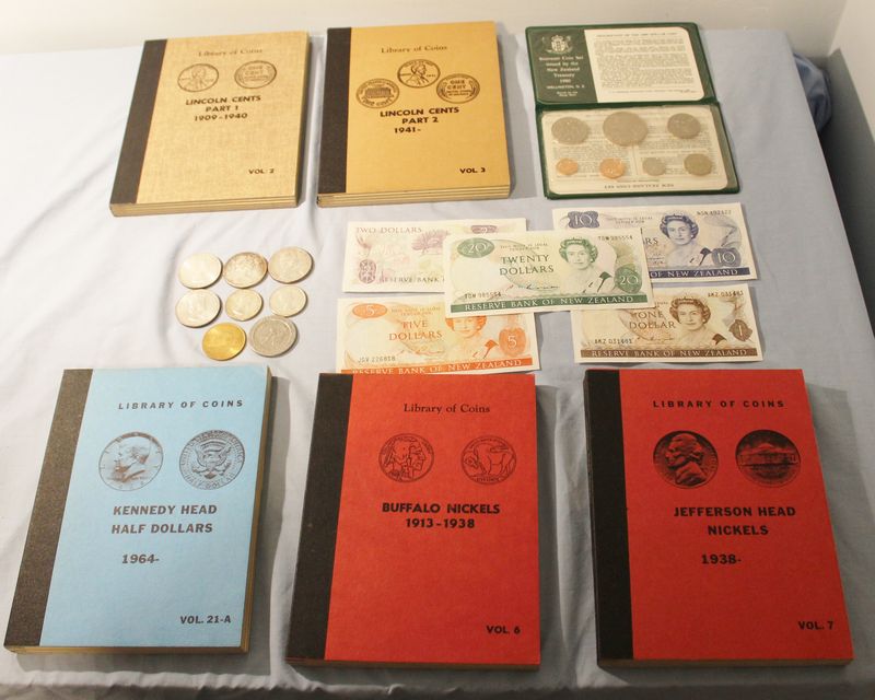 U.S. and foreign coins and currency including 14 Kennedy Half dollar coins (2 from 1964) in collector book; 3 Canadian silver dollars from 1964, 1966 & 1967; One Bermuda Crown coin from 1964; 2 Canadian half dollars from 1963 & 1964; a 1980 New Zealand Treasury Souvenir Coin Set; 1980's New Zealand currency including $20, $10, $5, $2 & $1 bills; partial coin books of 32 Buffalo Nickels, 71 Jefferson Nickels and 134 Lincoln Cents in 2 books (see photos); a Temple City of Canada $1 Token dated 1967; vintage Caesars Palace gaming token.
