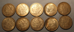 10 Morgan silver dollars including an 1885 O; 1886; 1886 O; 1887, 1887 O; 1888 O; 1888; 1889 O; 1889; 1890 O.