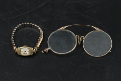 14K gold stamped Waltham wrist watch with elastic style band, also incl folding glasses, total weight being 31 grams.