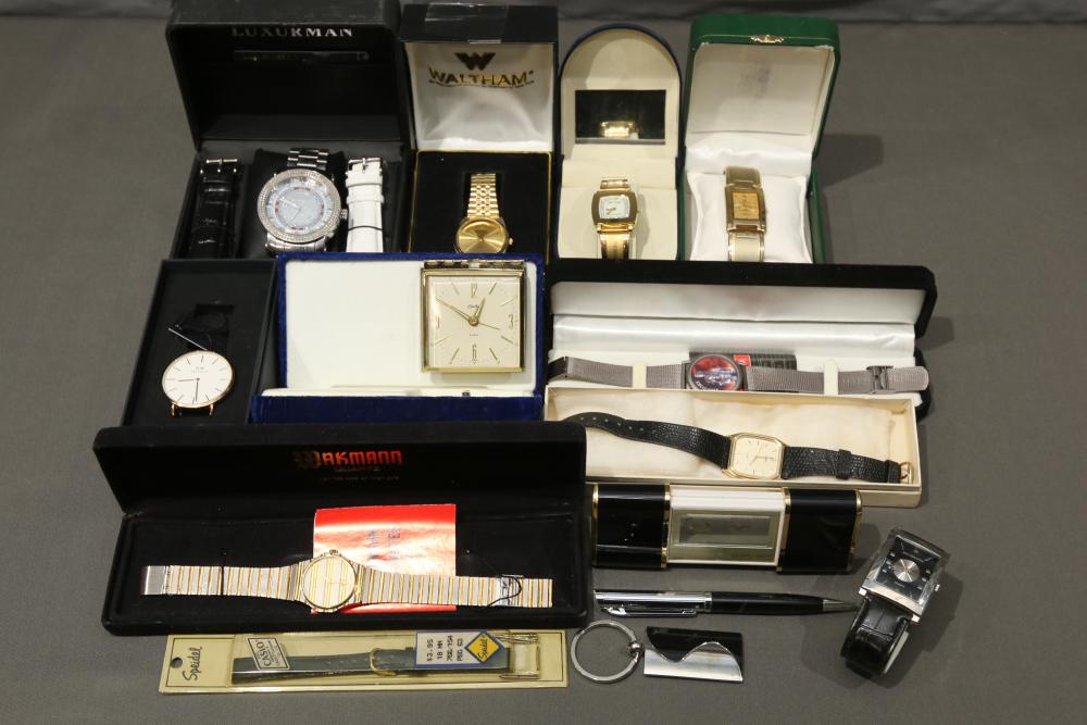 Wrist watches with brands incl Luxurman, John Christopher, Timex, Nexus, Yvea Renau, Waltham, also incl Daniel Wellington watch face, and travel alarm clock.