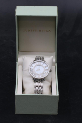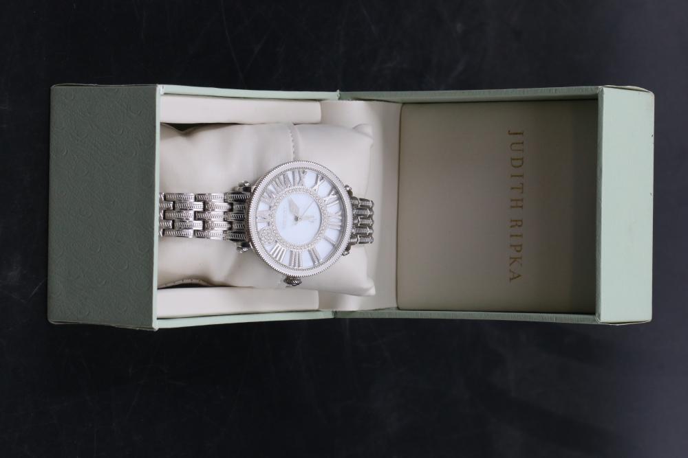 Judith Ripka womens wrist watch with mother of pearl face, metal band, in hard case.