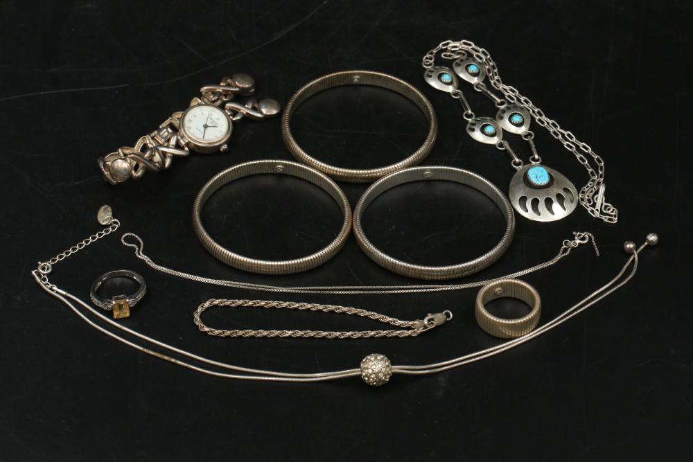 Sterling silver jewelry incl necklaces, watch, bracelets, ring, total weight being 108 grams.