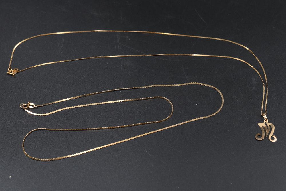 Two stamped 14K gold necklaces one with letter pendant "M", total weight being 4 grams.