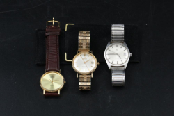 Two Mens Omega watches incl SeaMaster with gold tone band marked on back "Presented To Alaska McKinney", and Geneve with silver tone band marked on back "Waterproof", also incl Movado with Genuine Calfskin band.