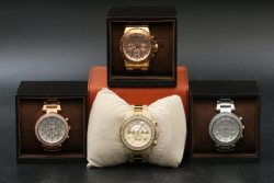 Four Michael Kors wrist watches with silver, rose, and gold tone bands, one with plastic and gold tone band, two with mother of pearl faces, models incl MK-5314,MK-5353, MK-5491, MK-5417.