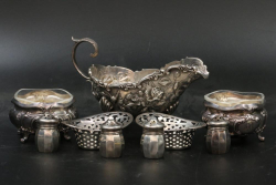 Sterling silver incl gravy pourer, salt and pepper shakers, small filigree style dishes, two small bowls with glass inserts, total weight of sterling items not including glass inserts being 338 grams.