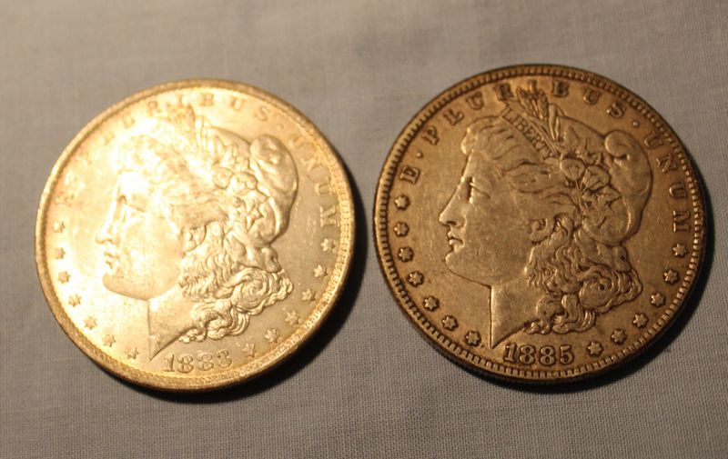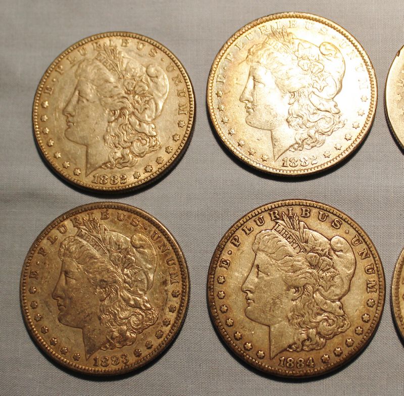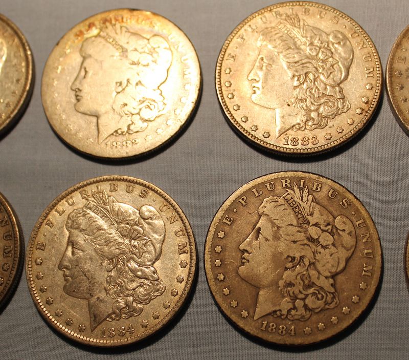 10 Morgan silver dollars including an 1882, 1882 O; 1882 S; 1883; 1883 O 1883 S; 1884 S; 1885.