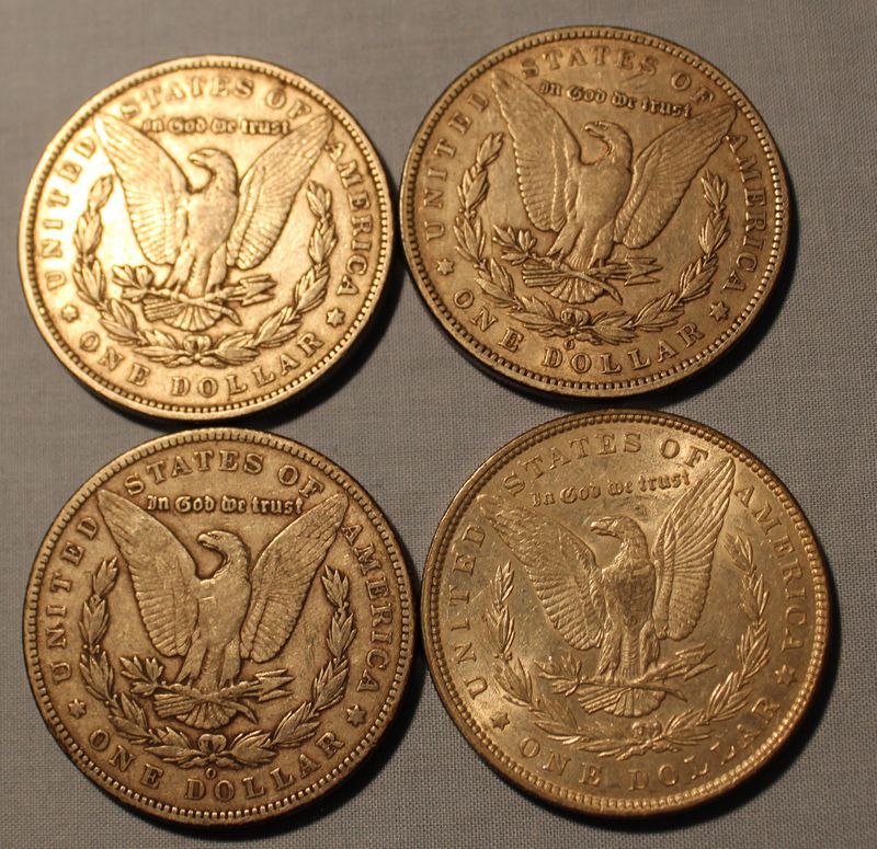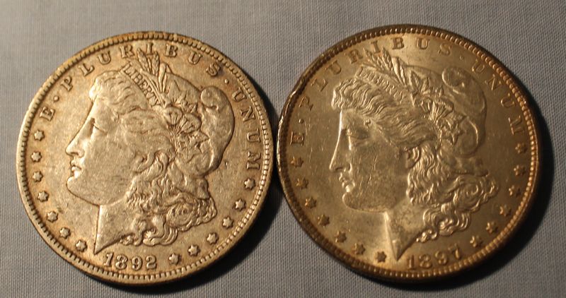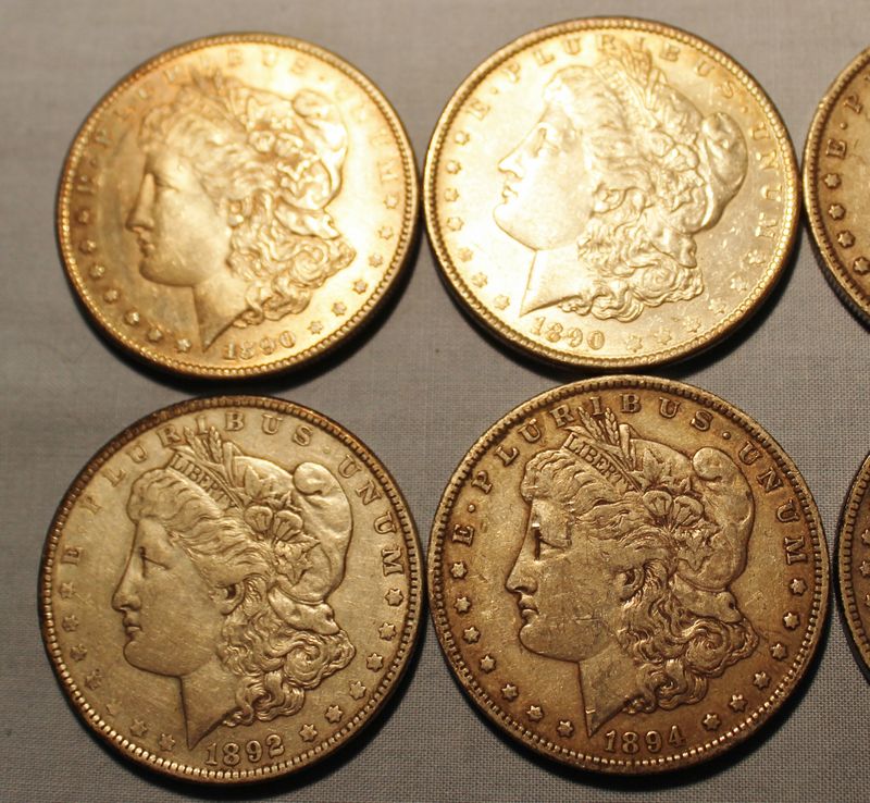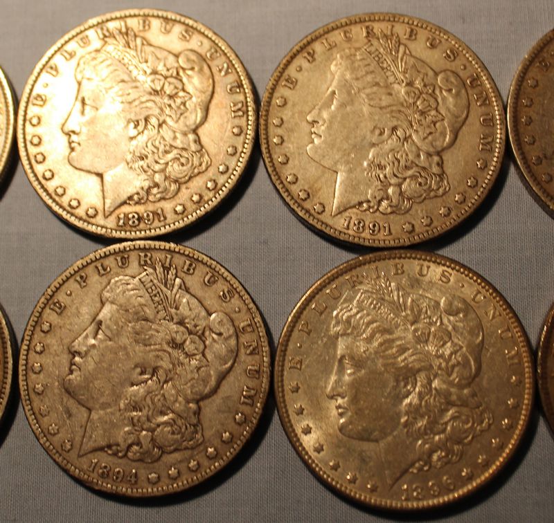 10 Morgan silver dollars including an 1890 S; 1890; 1891; 1891 O; 1892 O; 1892; 1894; 1894 O; 1896; 1897.