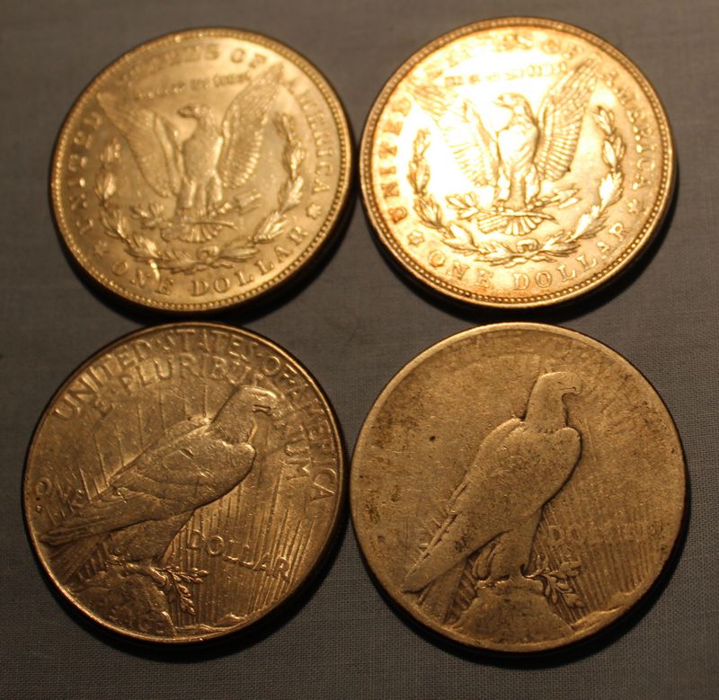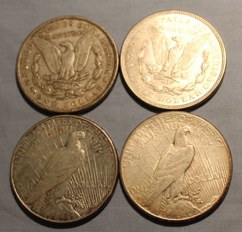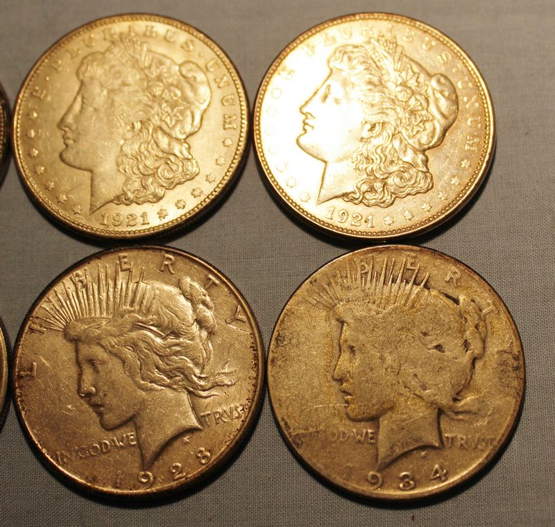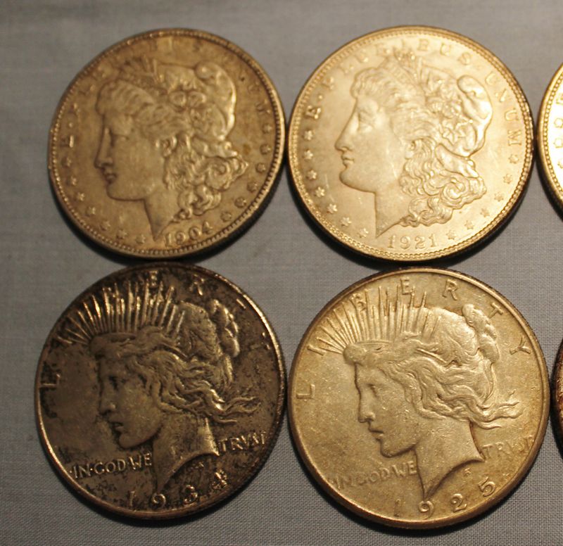 8 U.S. Silver dollars including 4 Morgans (1904; 1921; 1921 S; 1921 D) and 4 Peace dollars (1924 D: 1925 S; 1928 S; 1934).