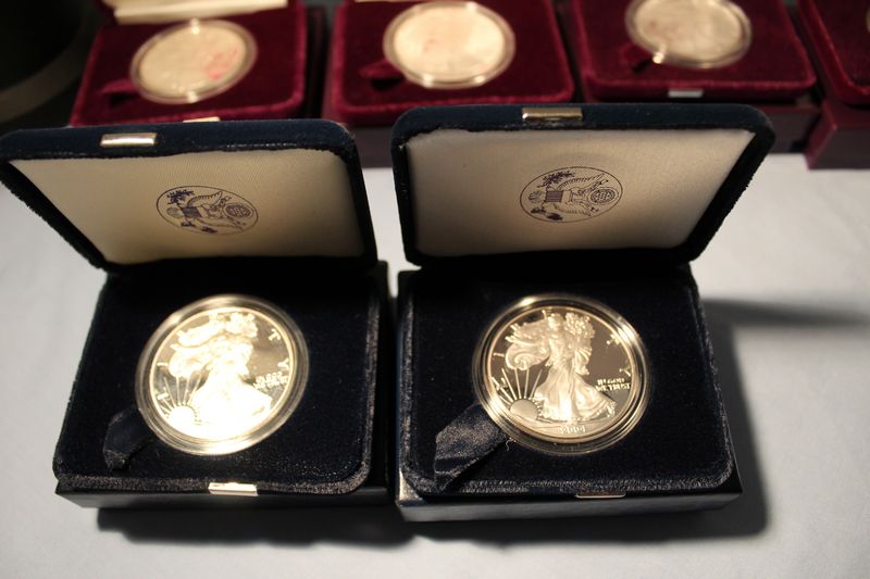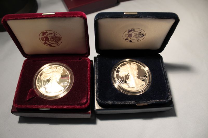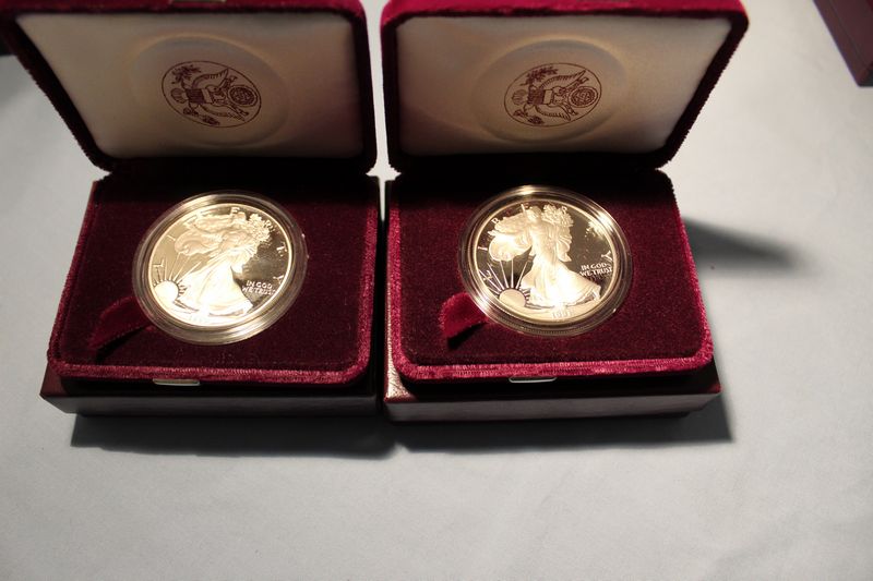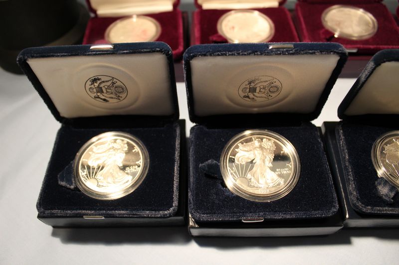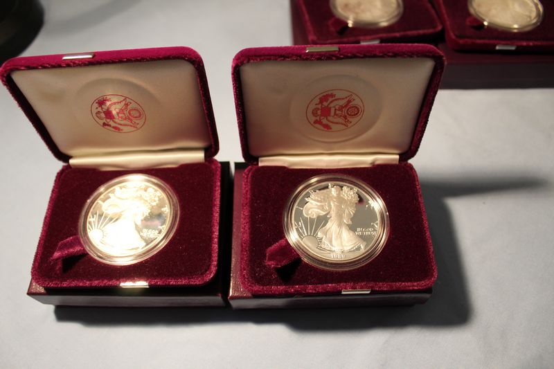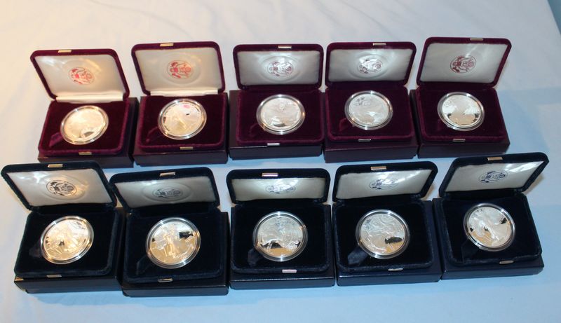 10 American Eagle one ounce proof silver bullion coins. Each coin is 99.9% silver. Dates include 1987, 1989, 1990, 1991, 1992, 1999, 1998, 2000, 2004, 2006.