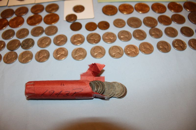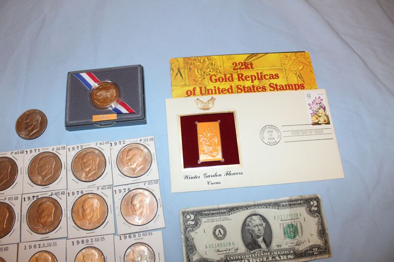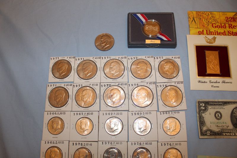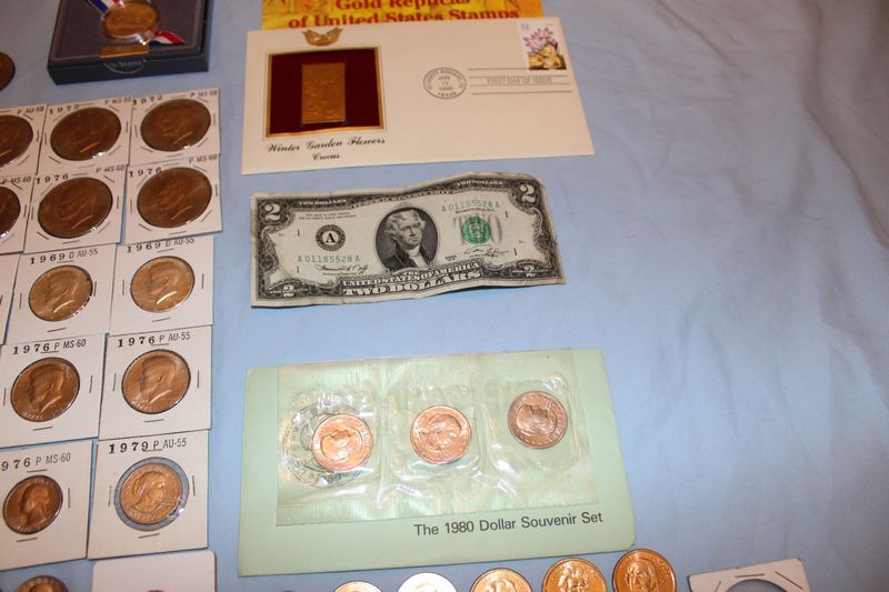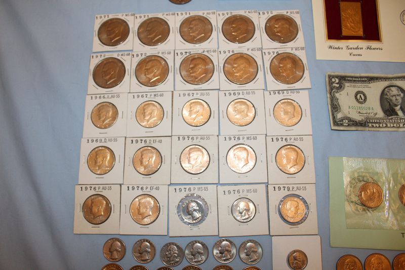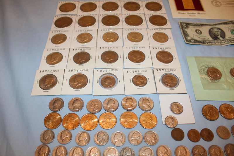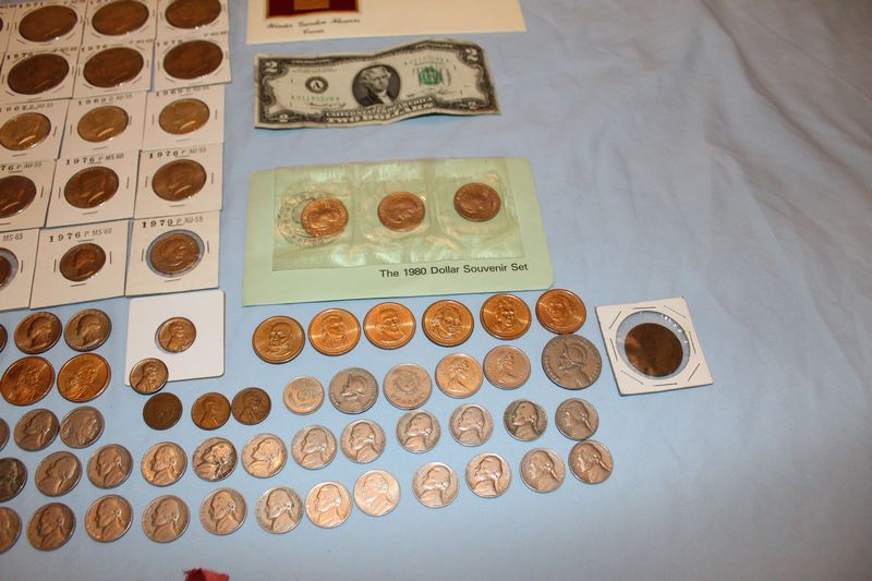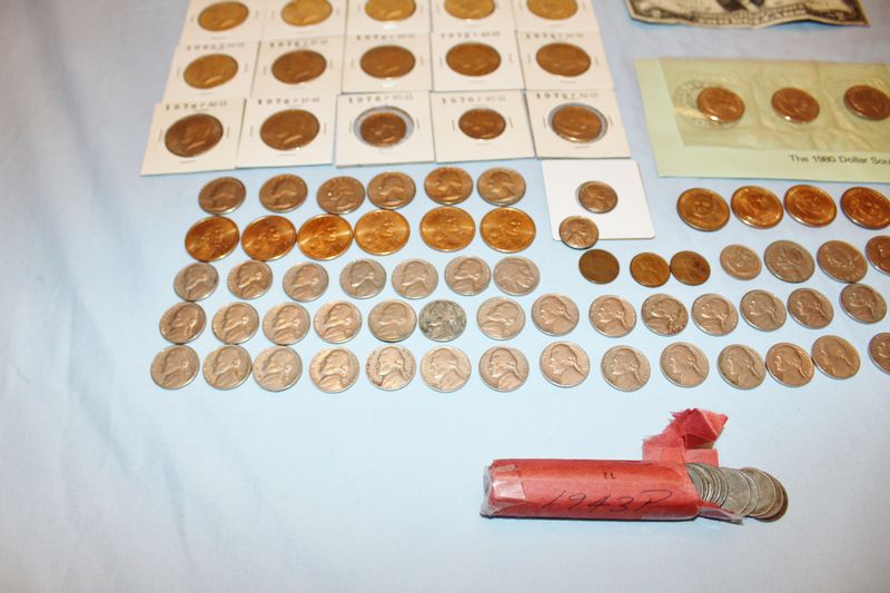 Coins and currency including 11 Eisenhower dollar coins; 12 Kennedy half dollars (1969 - 1979); 4 Susan B. Anthony dollars; 6 Sacagawea dollar coins; 6 Presidential dollar coins; a 1976 $2 bill; 41 vintage nickels; fifty-two 1943 steel pennies; 1991 Mt. Rushmore anniversary half dollar; misc. foreign coins