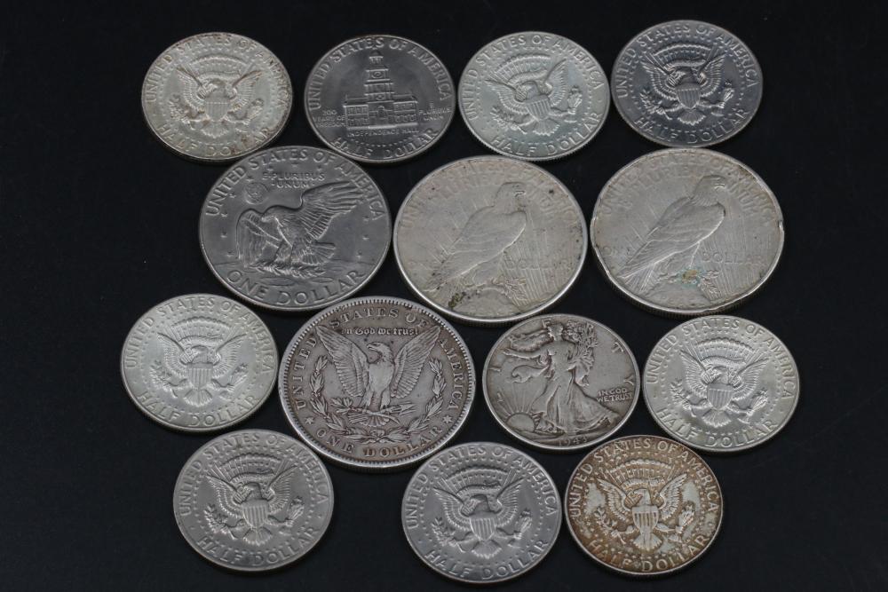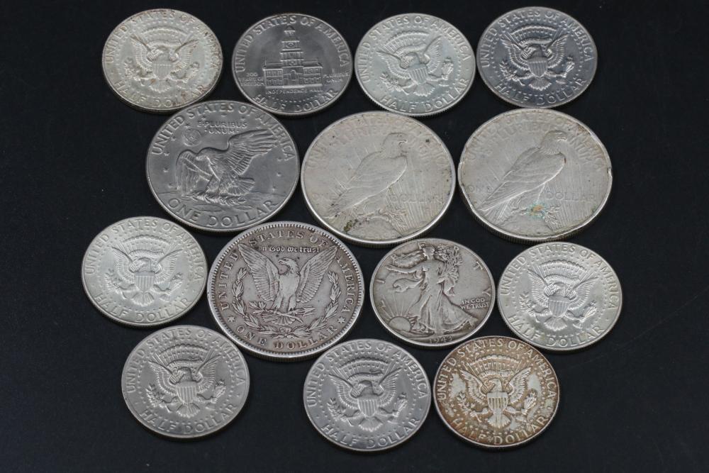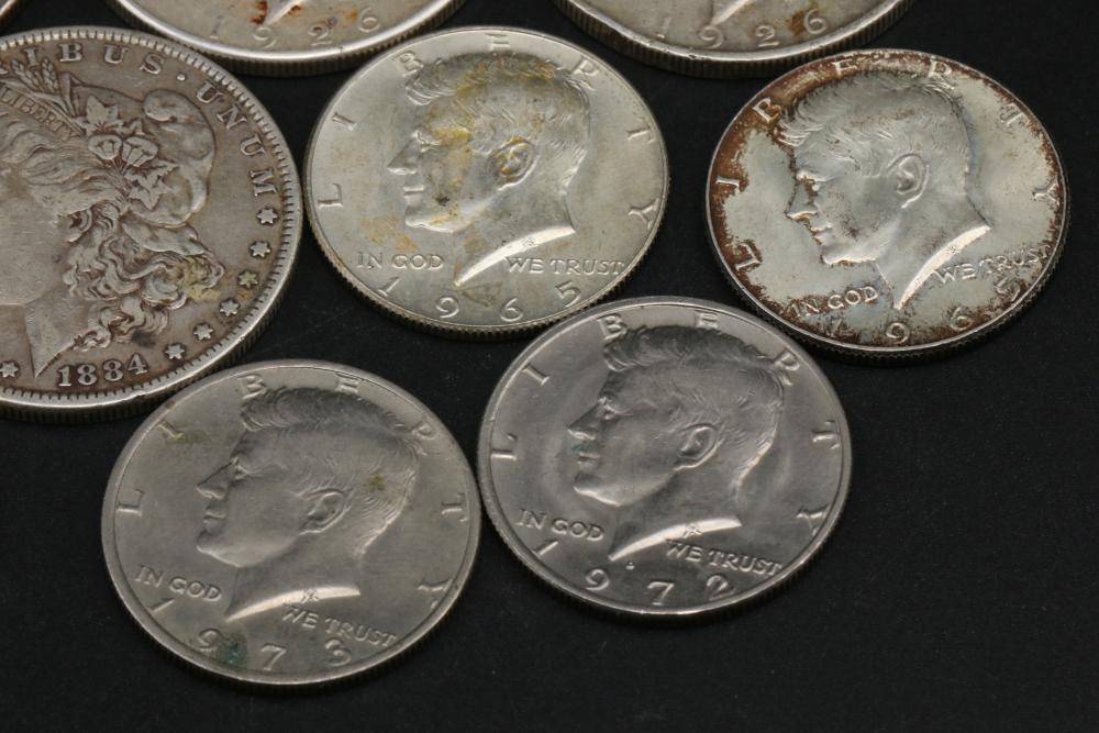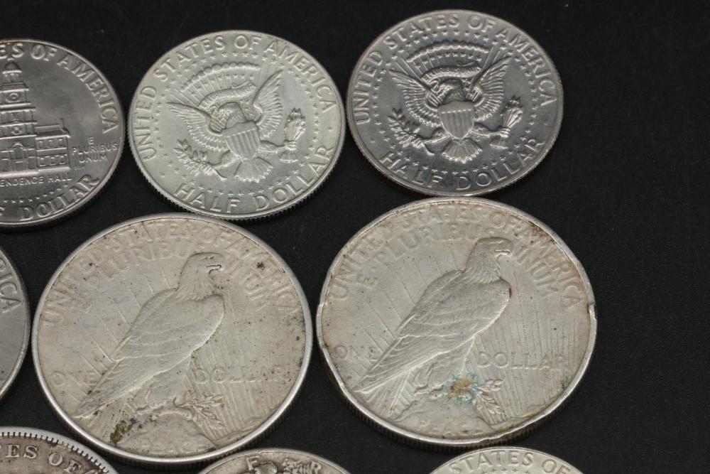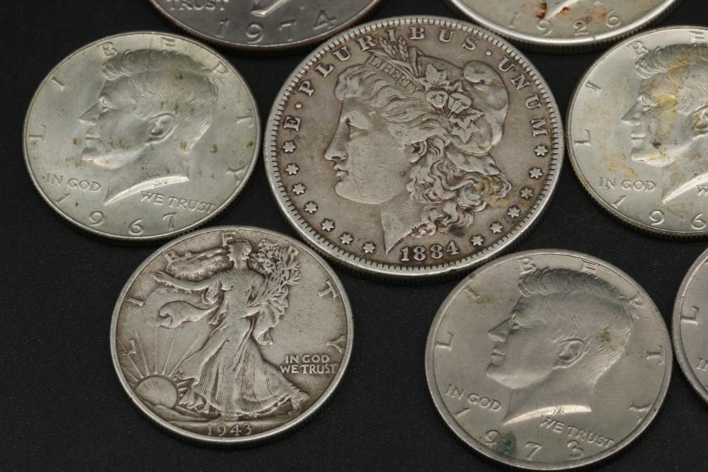 U.S. Currency incl half and silver dollar coins incl 1884 Morgan, x2 1926 Peace dollar, 1974 Eisenhower, Walking Liberty Half dollar 1943, Kennedy halfs years incl 1964, 1965, 1967, 1968, 1971, 1972, 1973.