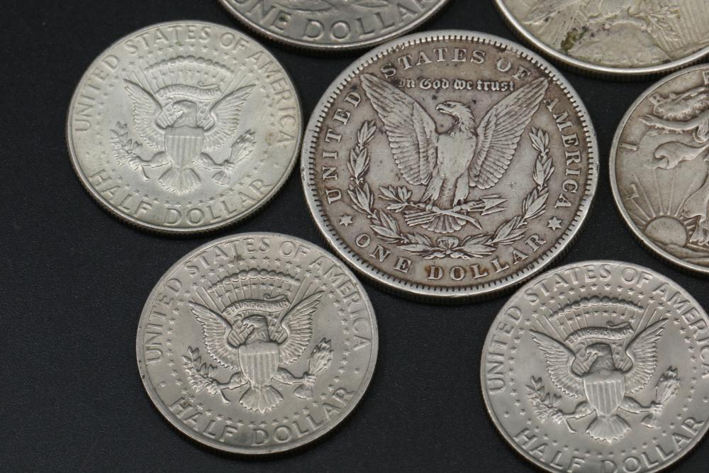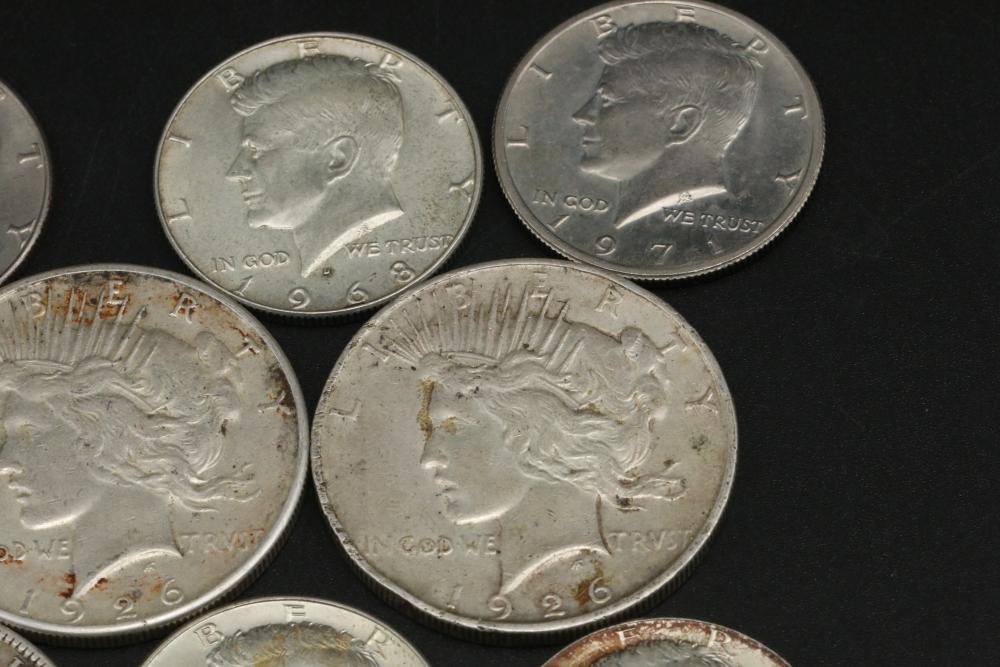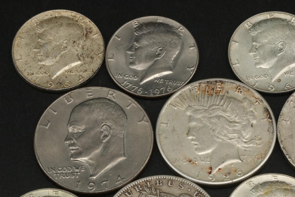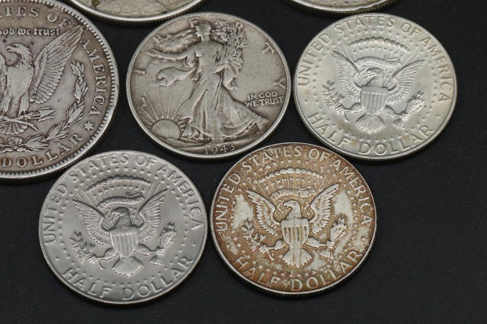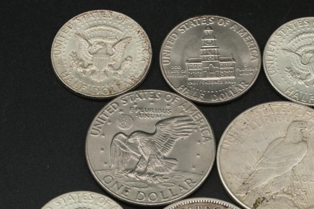 U.S. Currency incl half and silver dollar coins incl 1884 Morgan, x2 1926 Peace dollar, 1974 Eisenhower, Walking Liberty Half dollar 1943, Kennedy halfs years incl 1964, 1965, 1967, 1968, 1971, 1972, 1973.