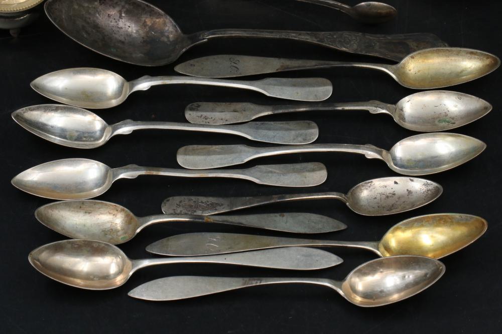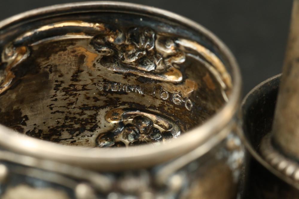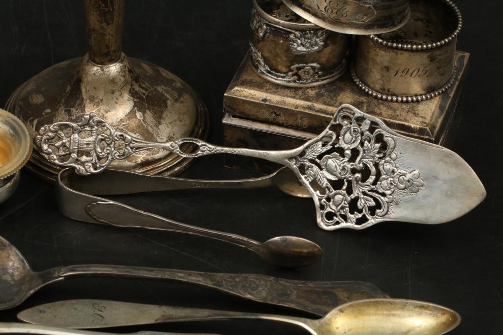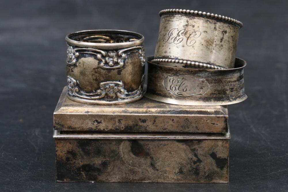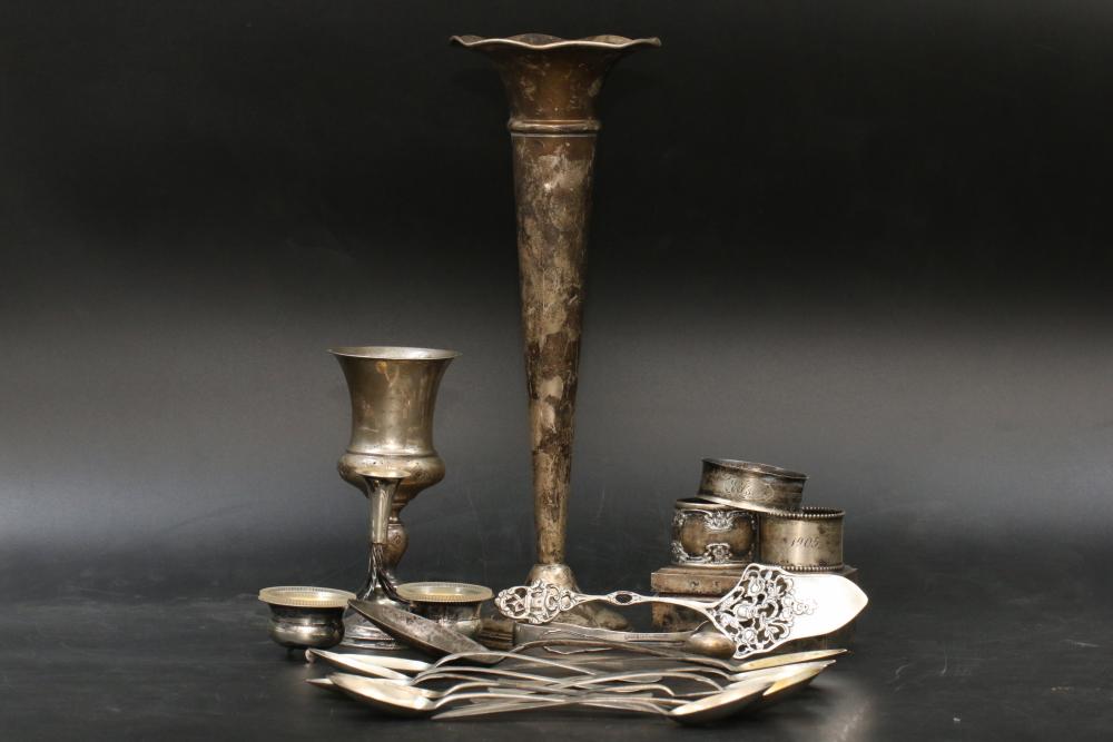 Silver items incl Sterling silver, weighted, 800, and believed to be coin incl spoons, sterling box with wood insert, goblet, napkin rings, weighted vase, total weight of sterling being 137grams, total for weighted and sterling box being 433grams, total weight of marked "800" items being 255grams, and 43grams of believed to be coin silver.