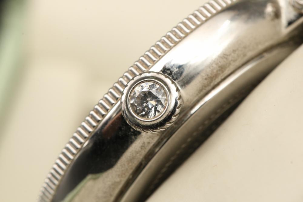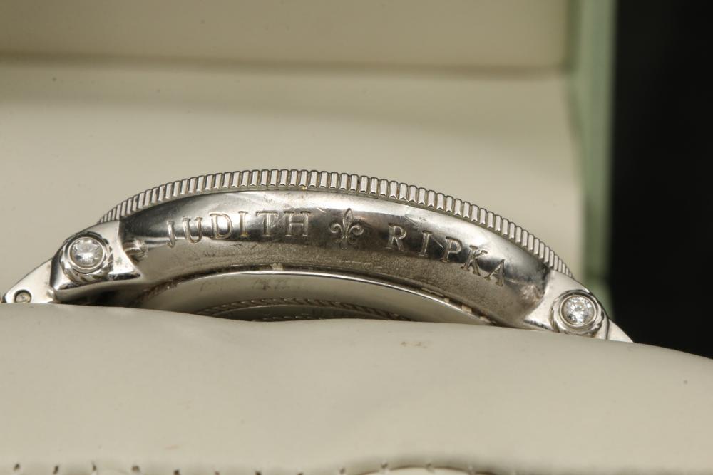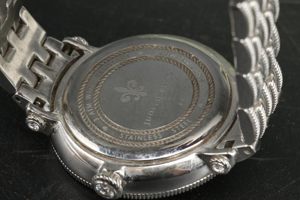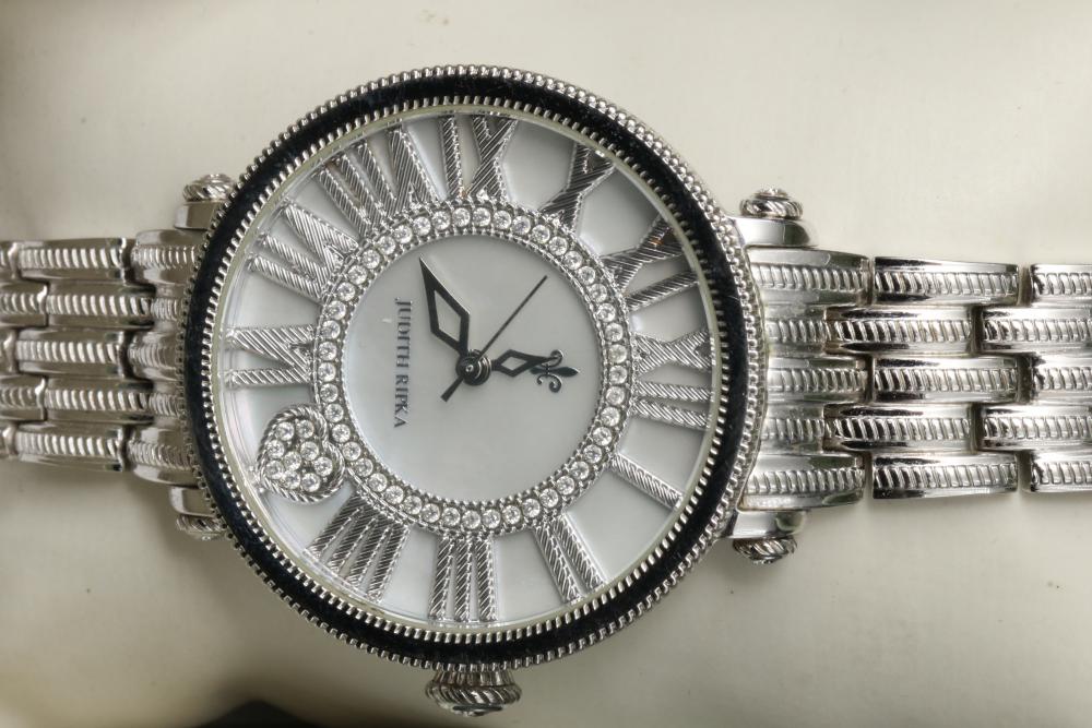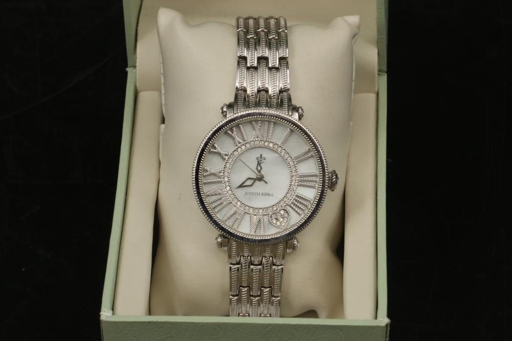 Judith Ripka womens wrist watch with mother of pearl face, metal band, in hard case.