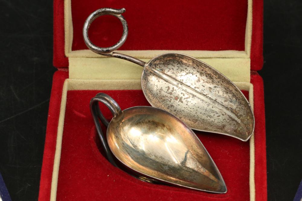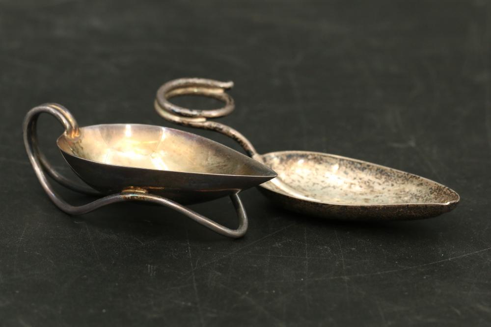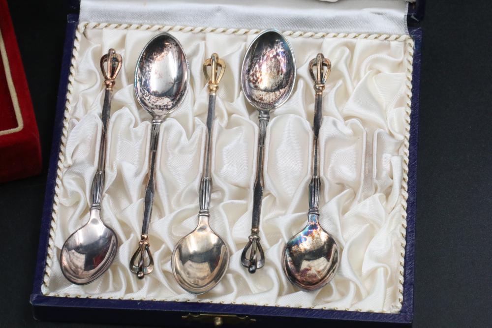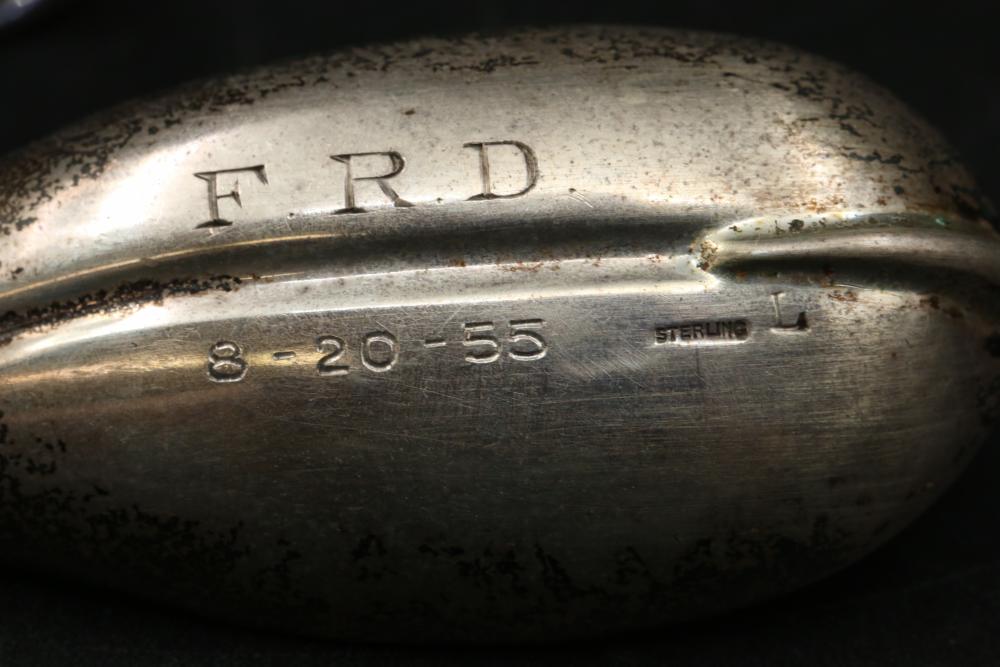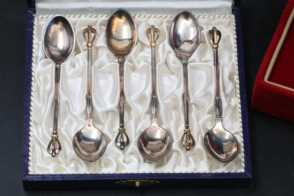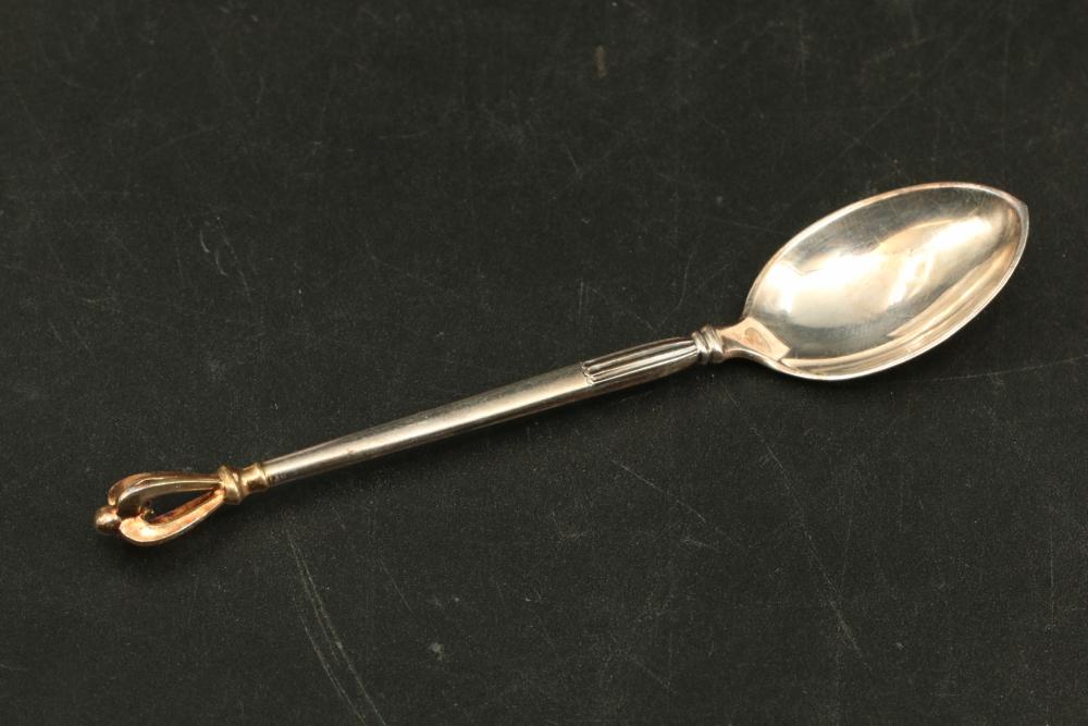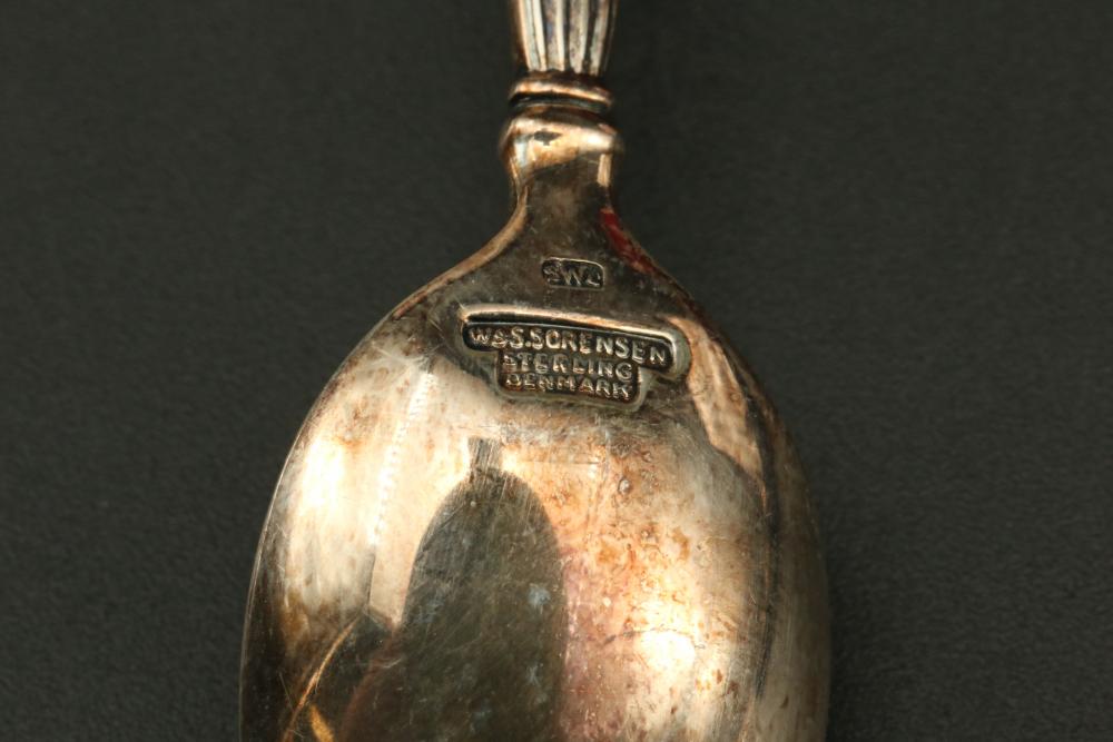W & S Sorensen demitasses gold wash crown spoons, also incl small spoon marked on underside "F.R.D. 8-20-55", total weight being 127grams.