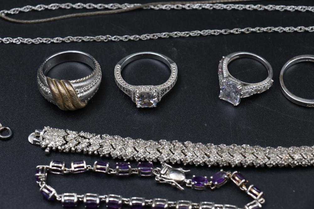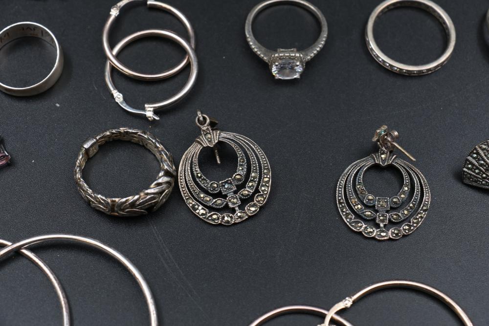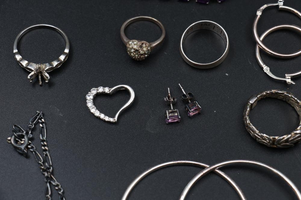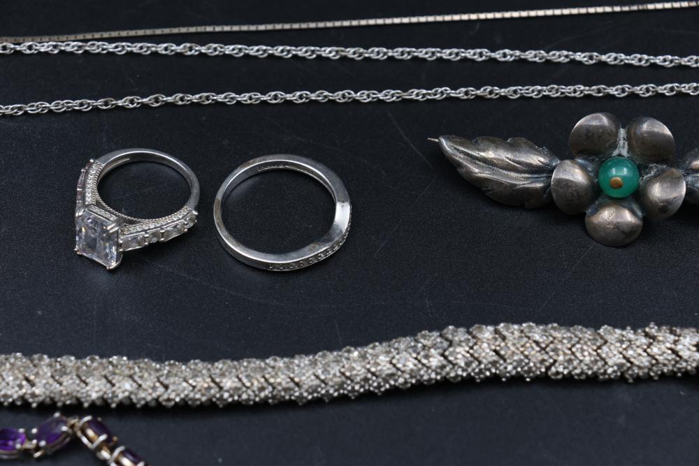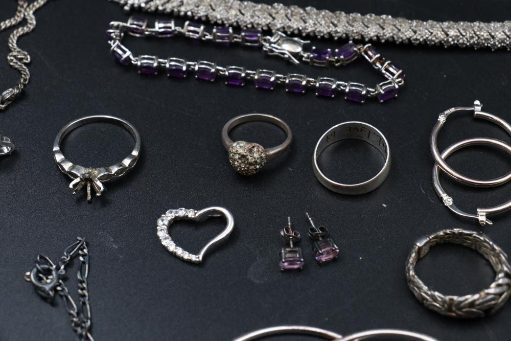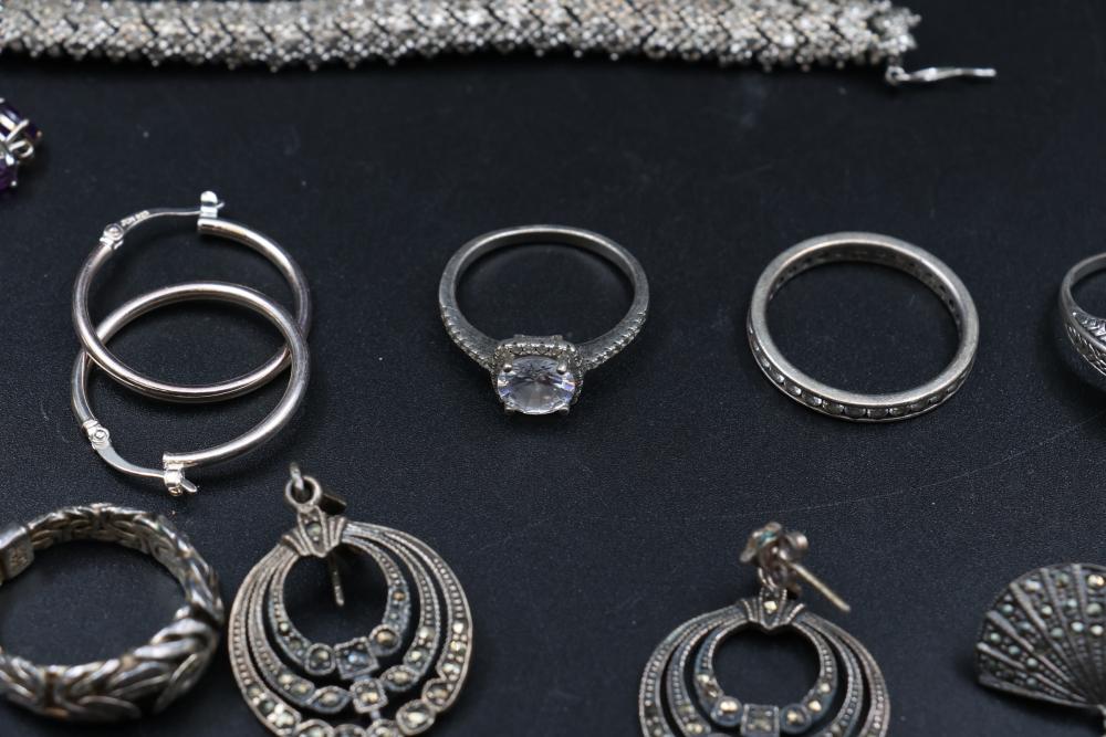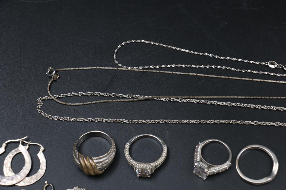 Sterling silver jewelry incl necklaces, pendants, rings, bracelets, earrings, total weight being 195 grams.