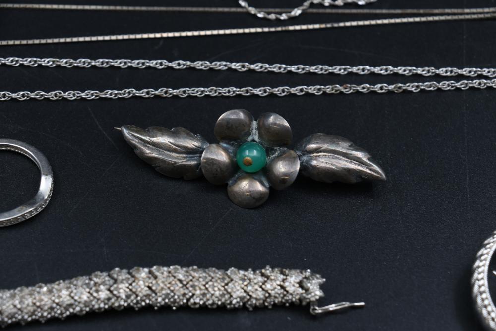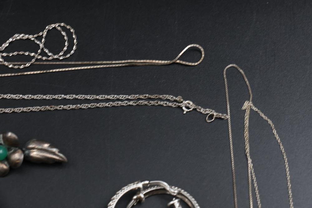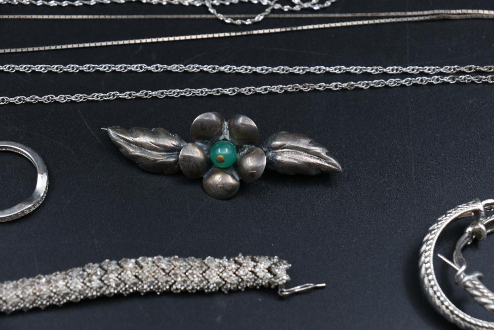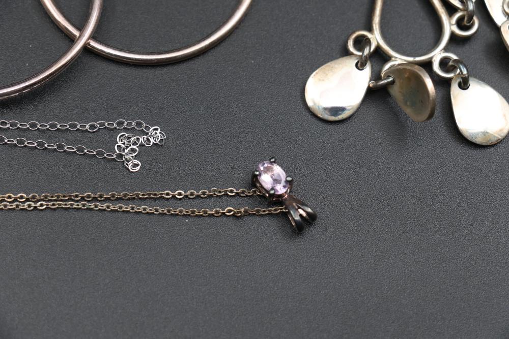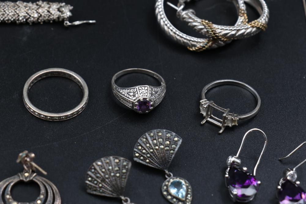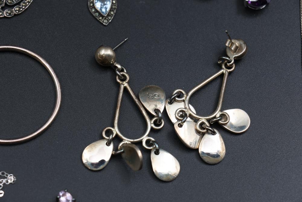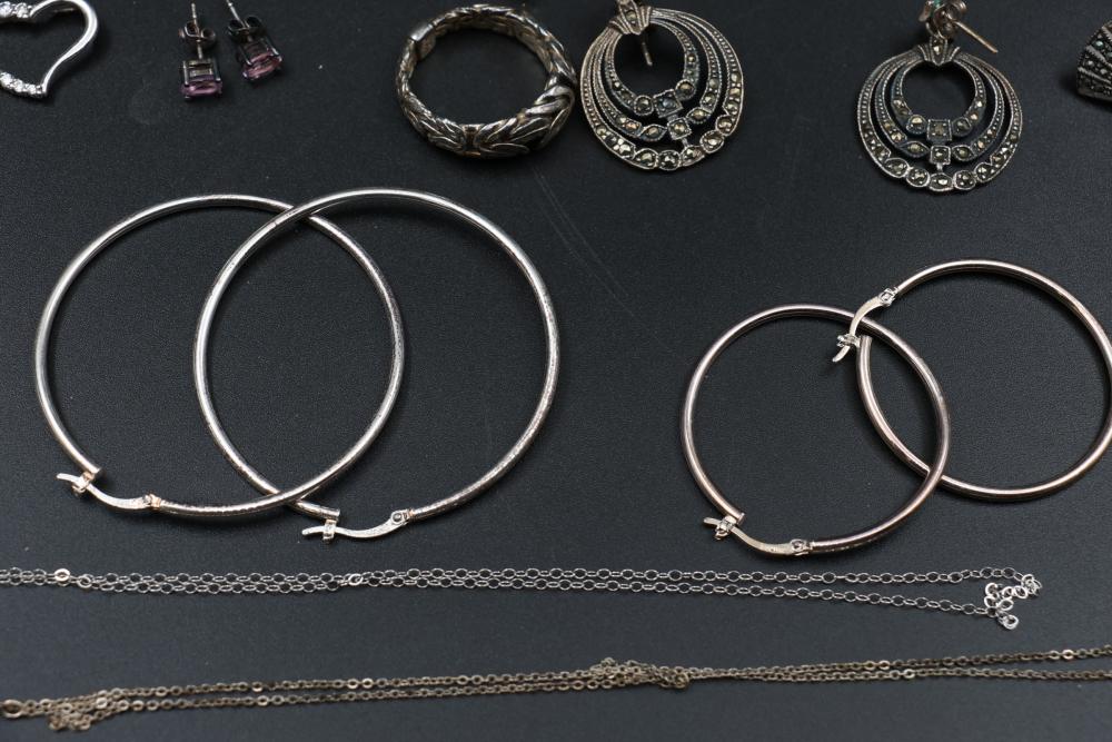 Sterling silver jewelry incl necklaces, pendants, rings, bracelets, earrings, total weight being 195 grams.