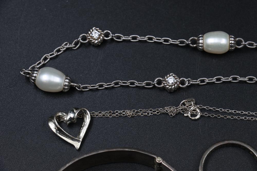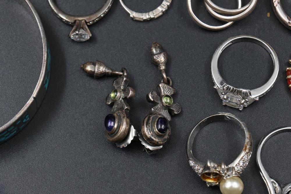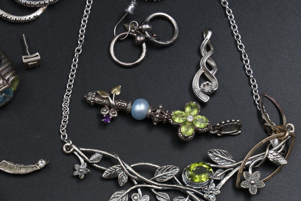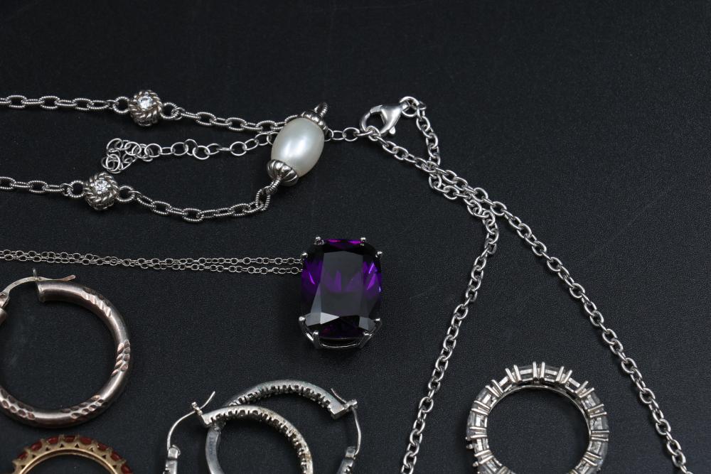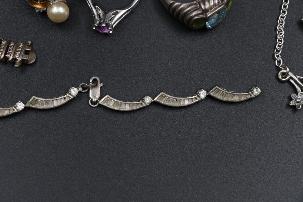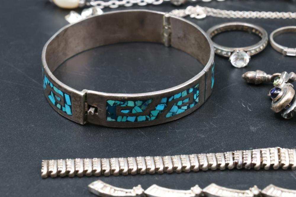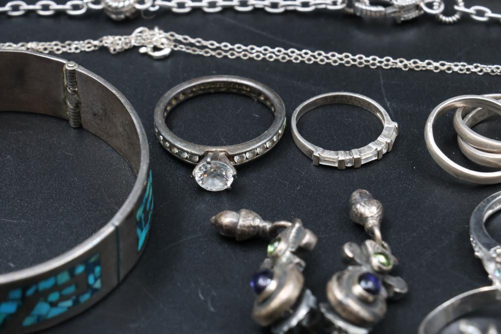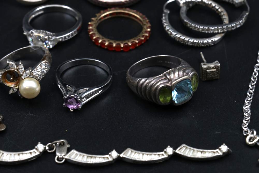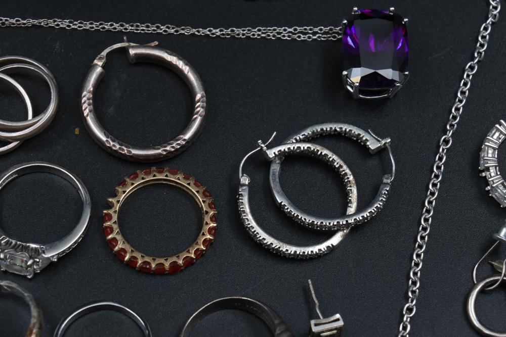 Sterling silver jewelry incl necklaces, pendants, rings, bracelets, earrings, total weight being 210 grams.