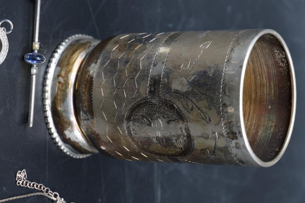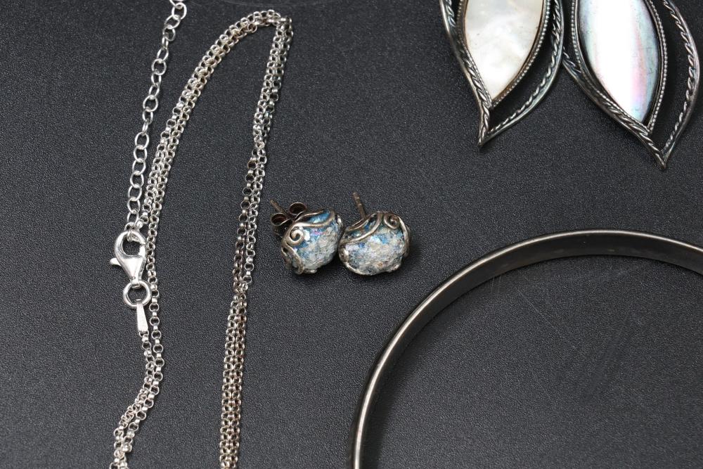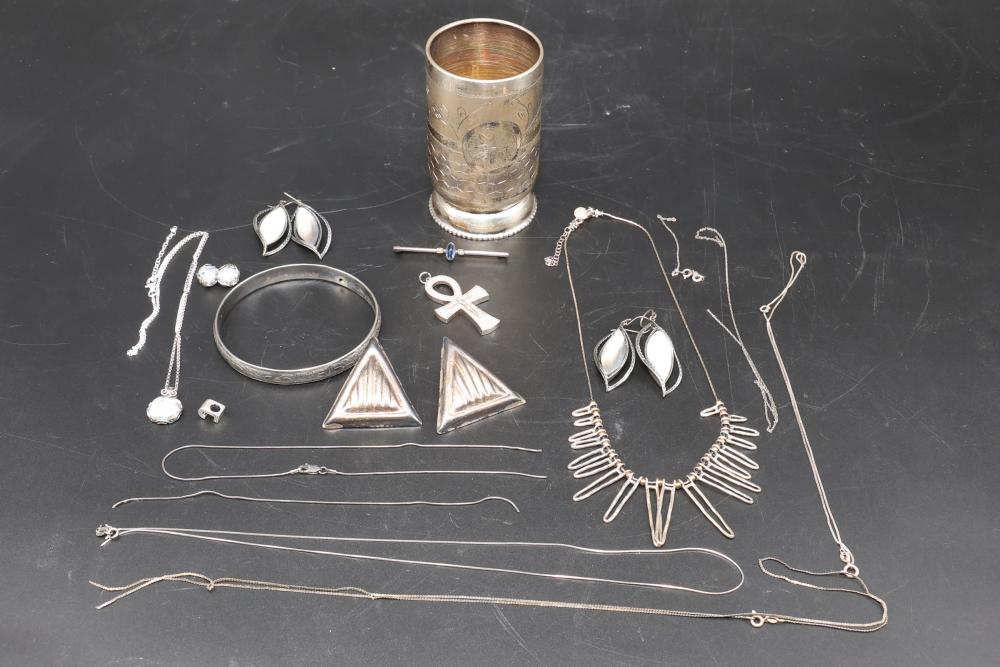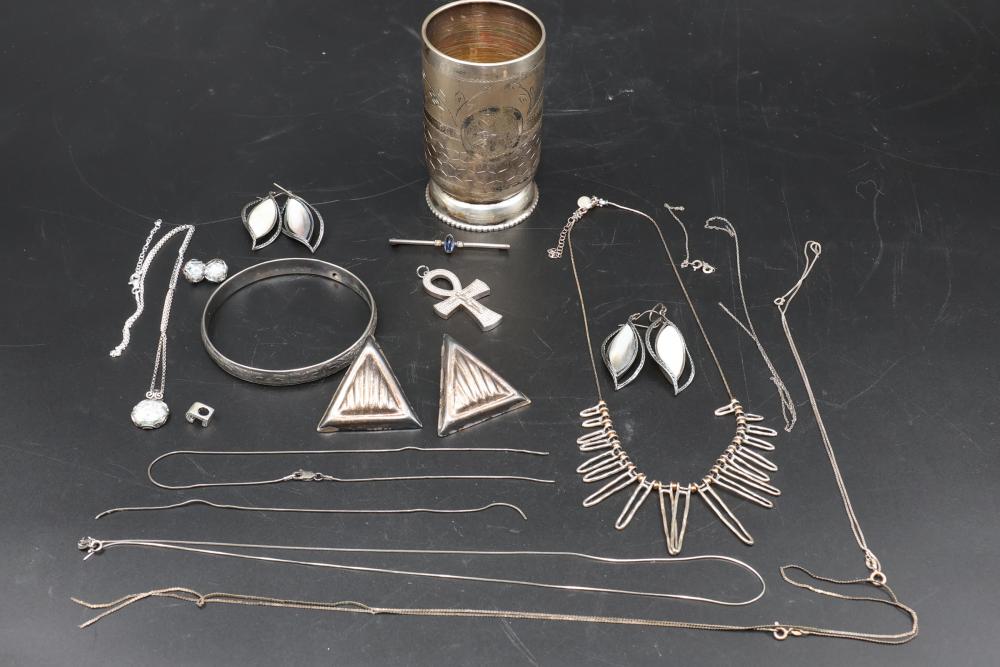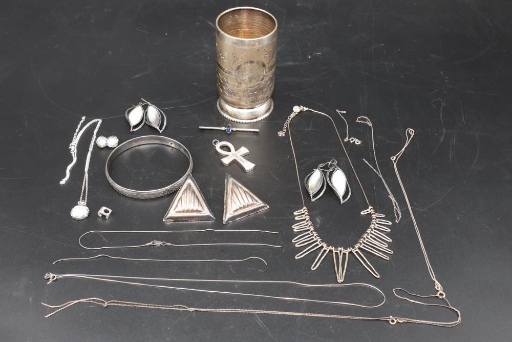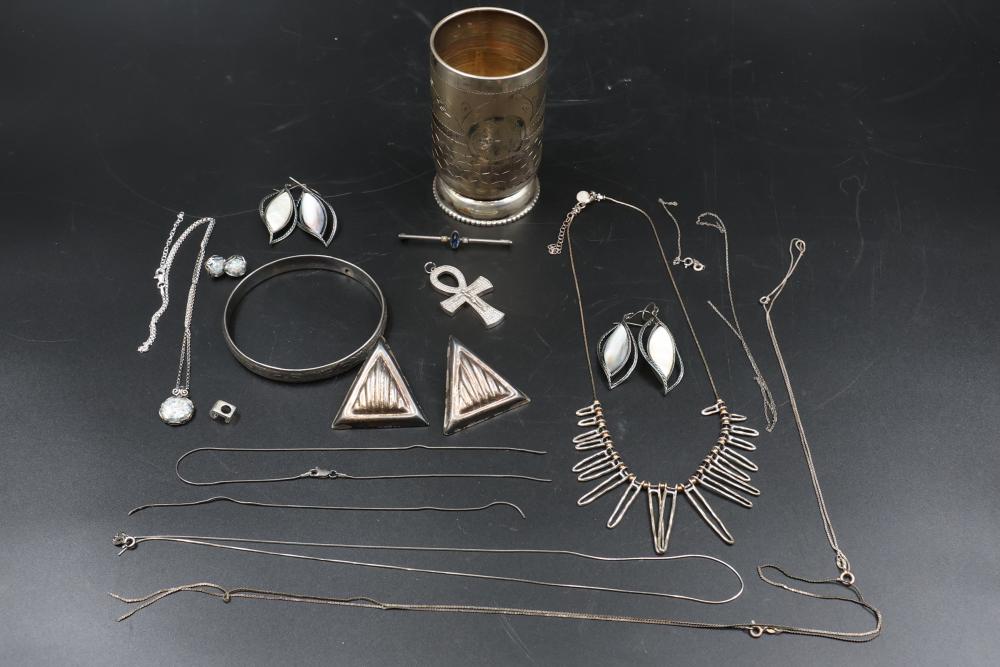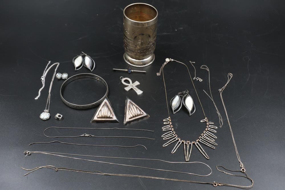 Sterling silver jewelry incl earrings, pendant, necklaces, bracelet, cup, total weight being 198 grams.