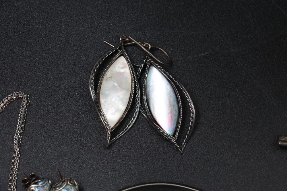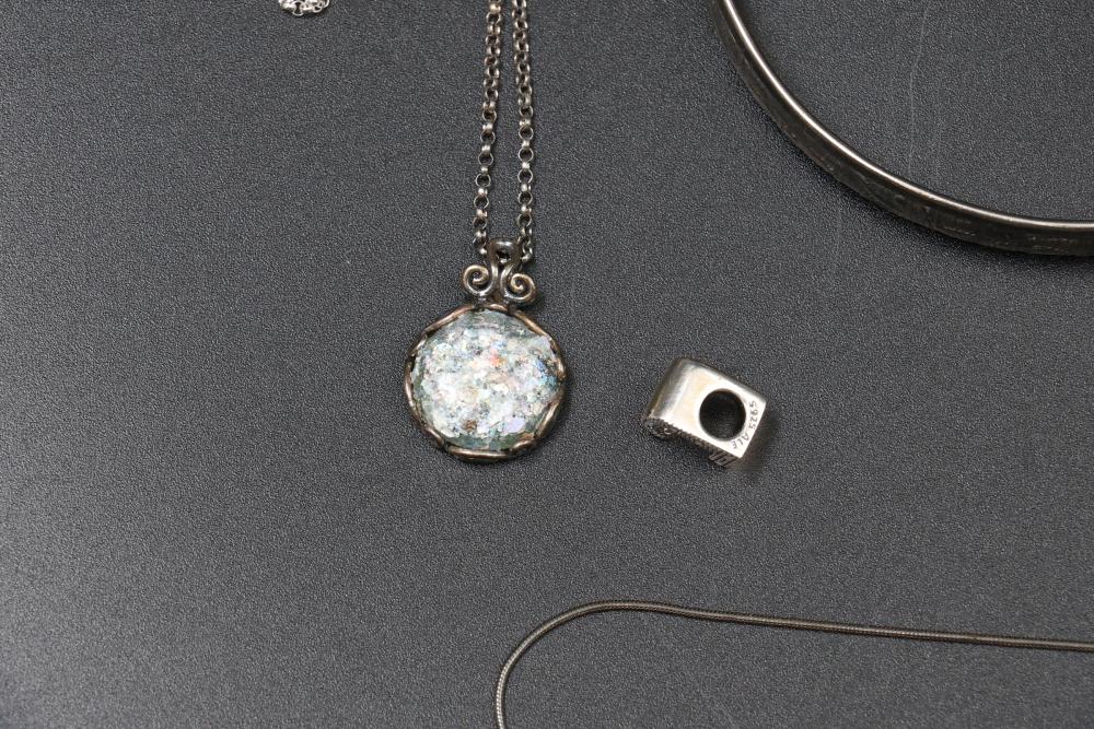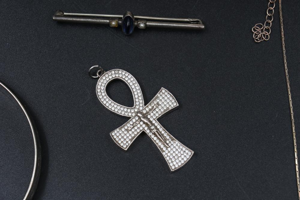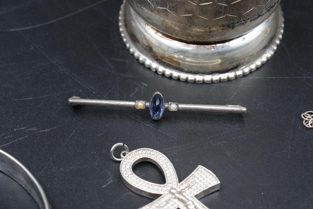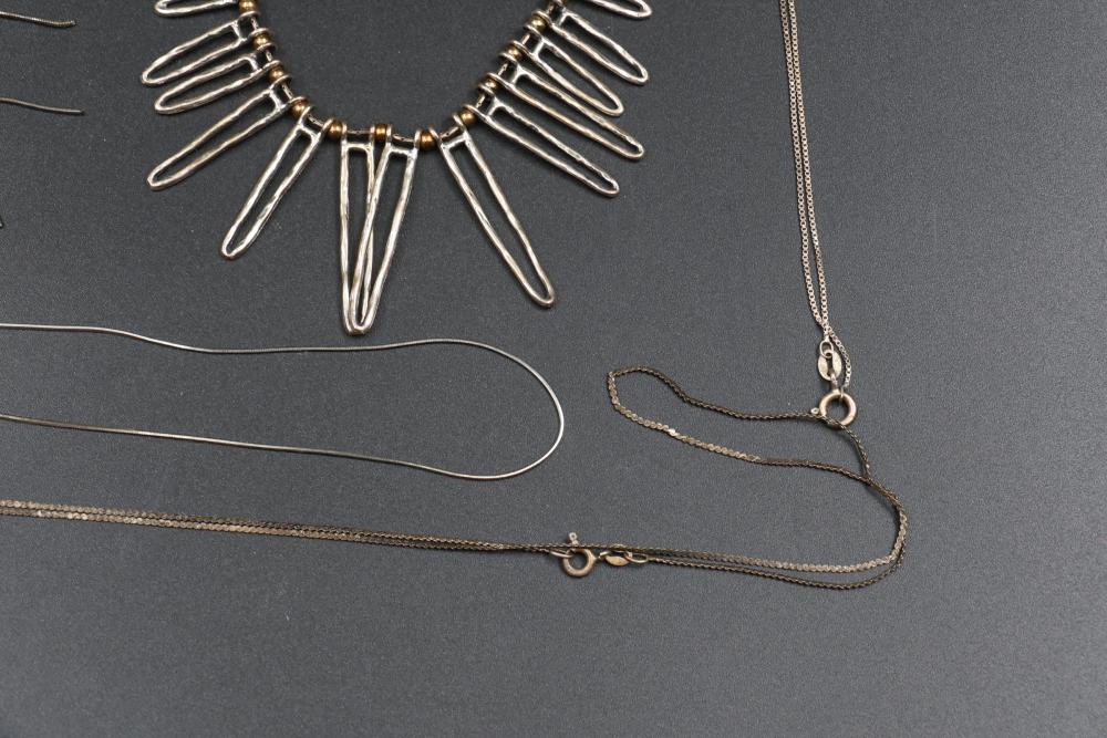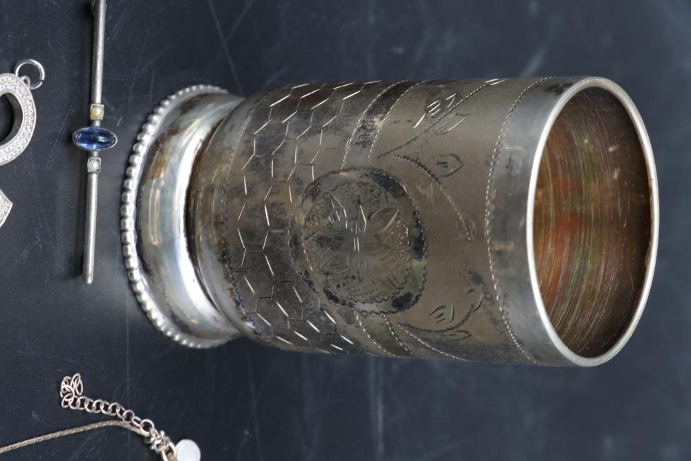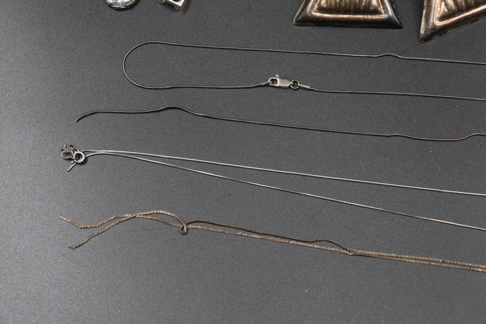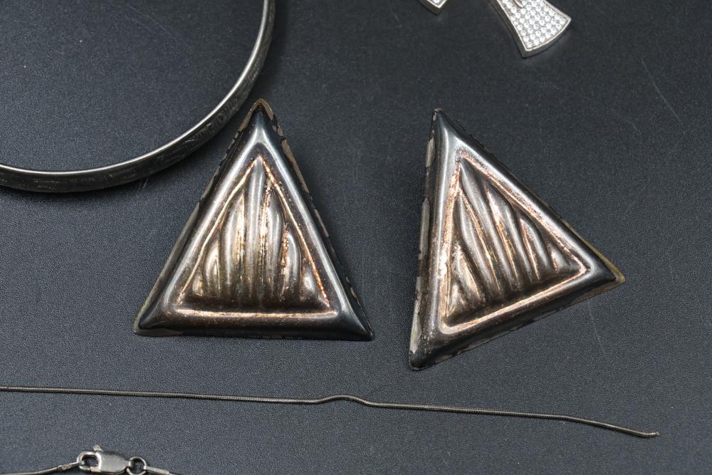 Sterling silver jewelry incl earrings, pendant, necklaces, bracelet, cup, total weight being 198 grams.