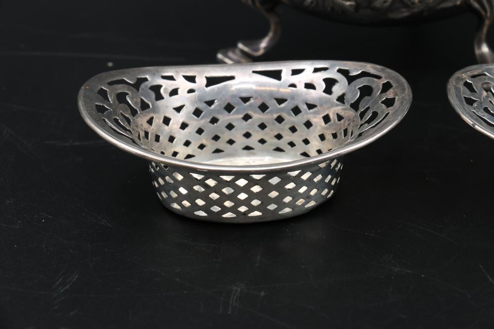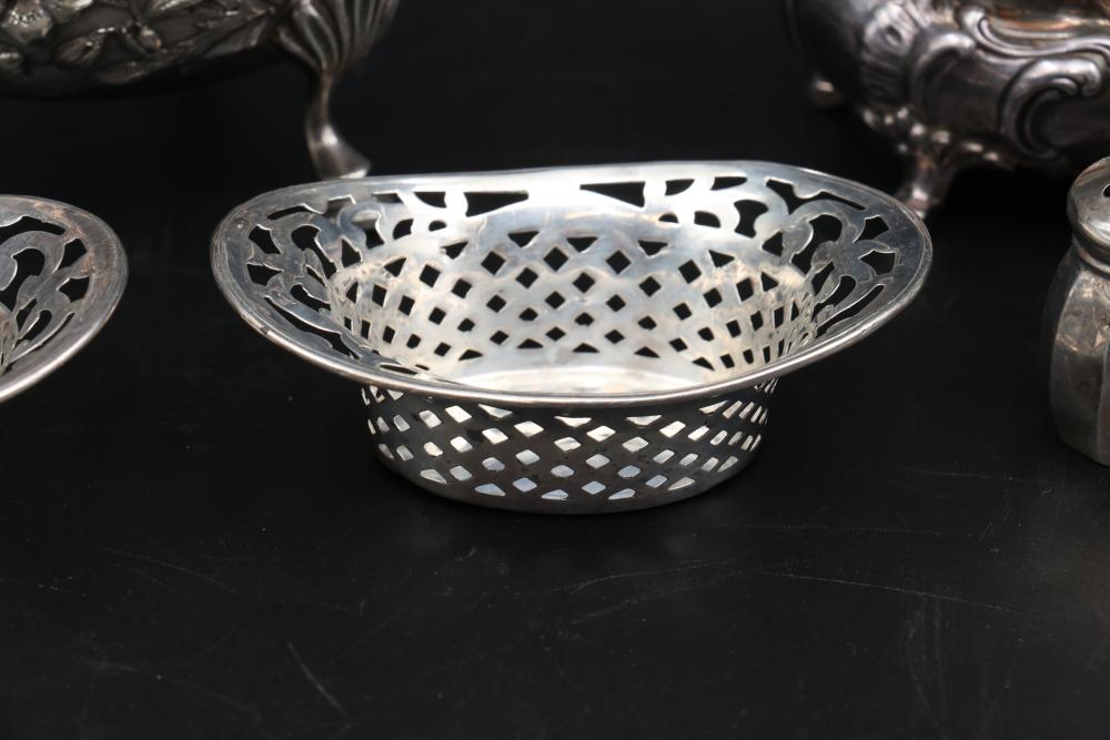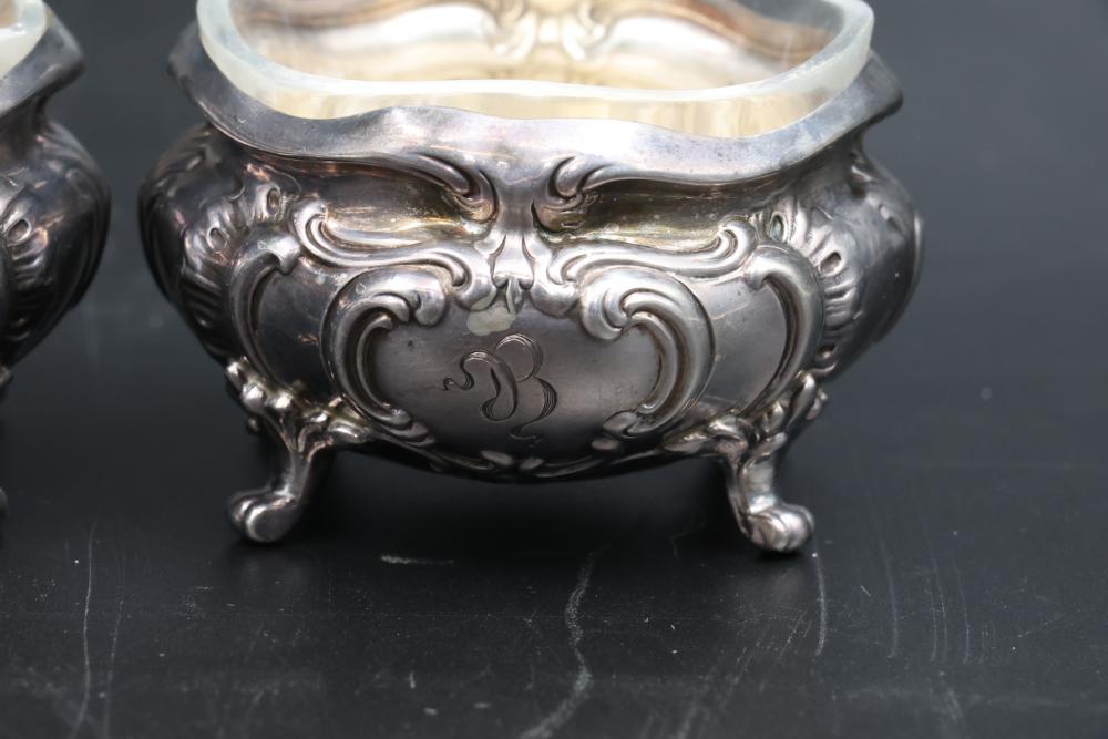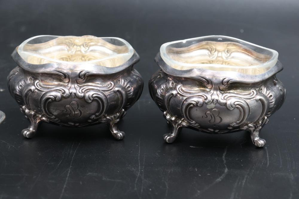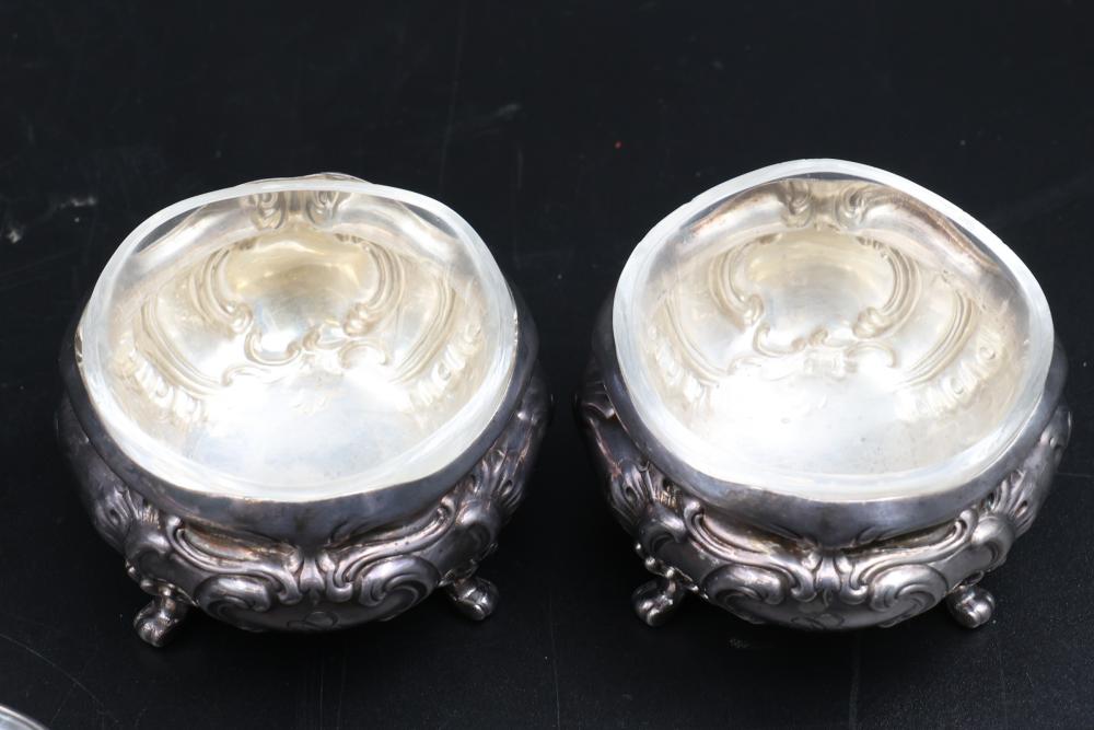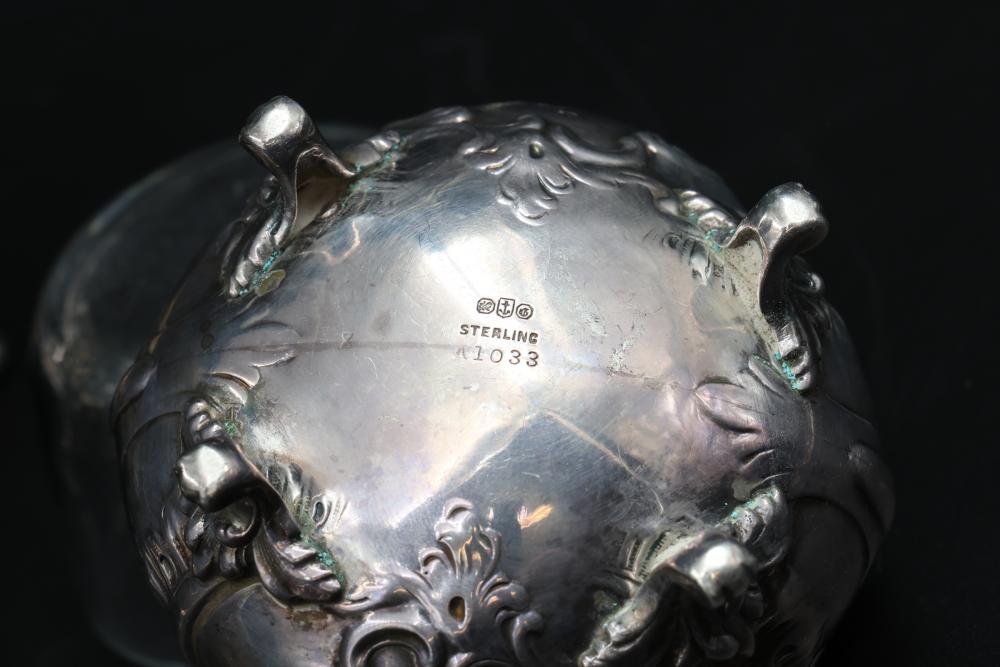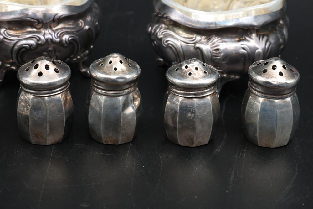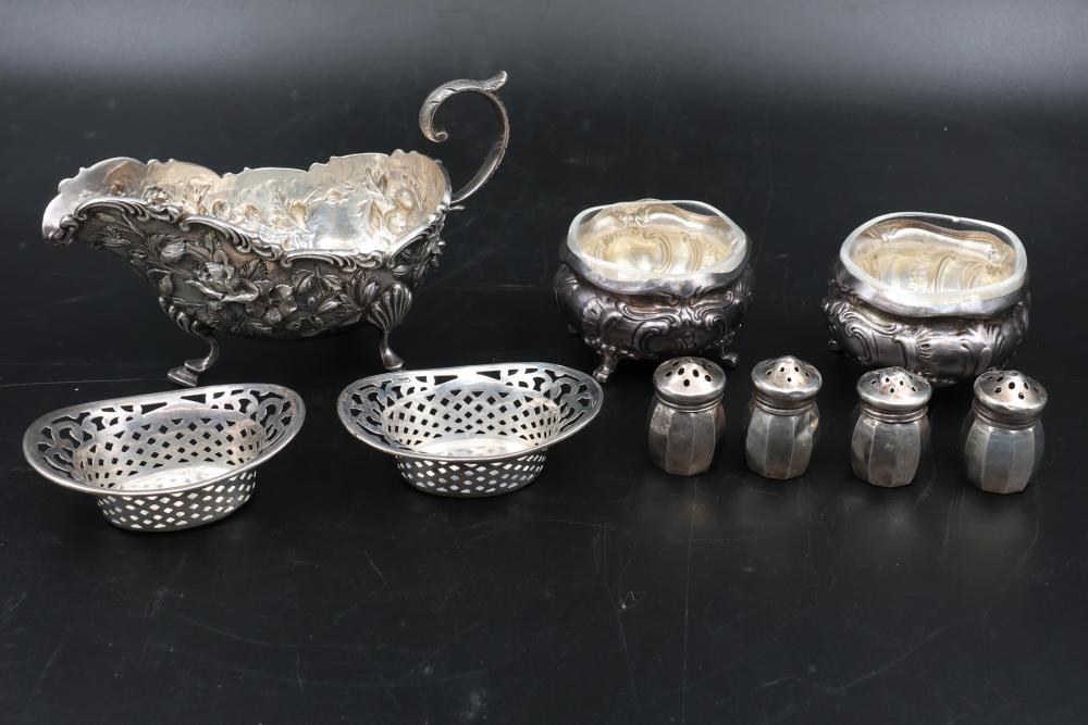 Sterling silver incl gravy pourer, salt and pepper shakers, small filigree style dishes, two small bowls with glass inserts, total weight of sterling items not including glass inserts being 338 grams.