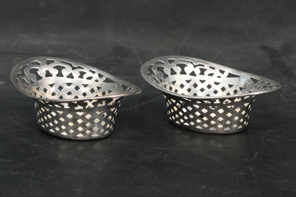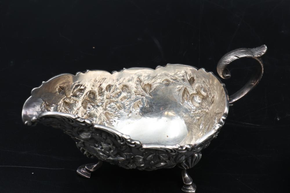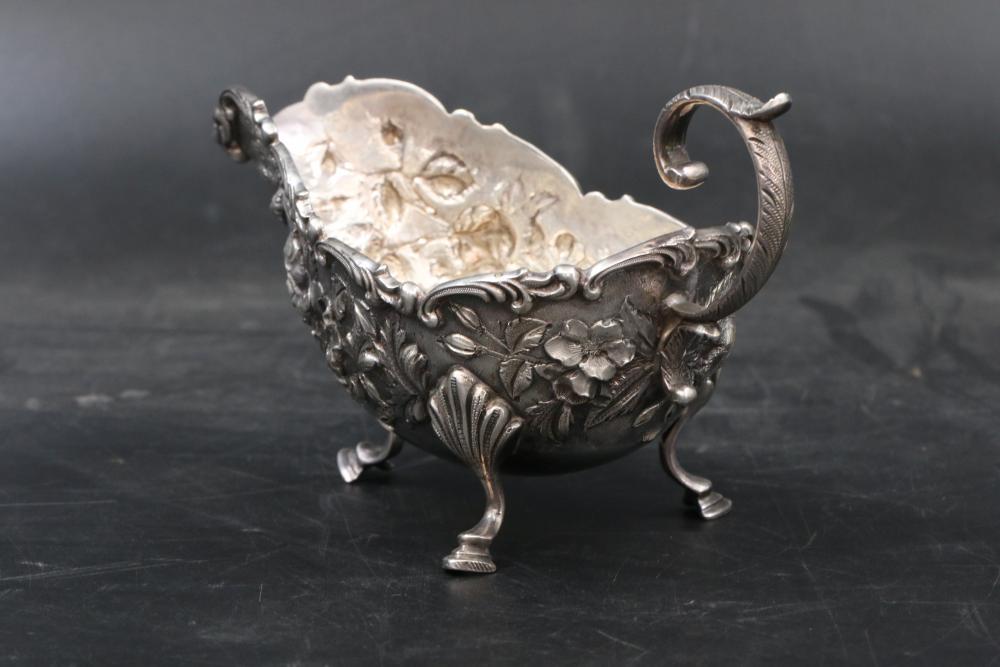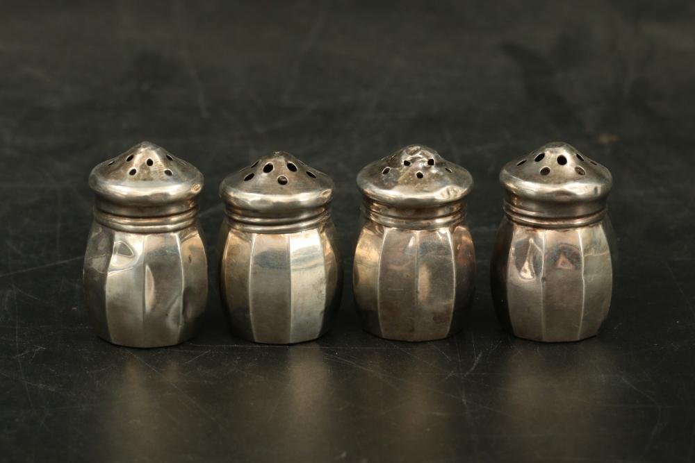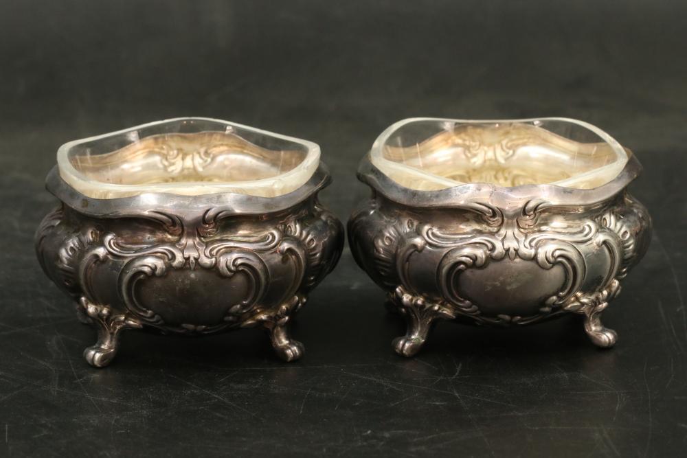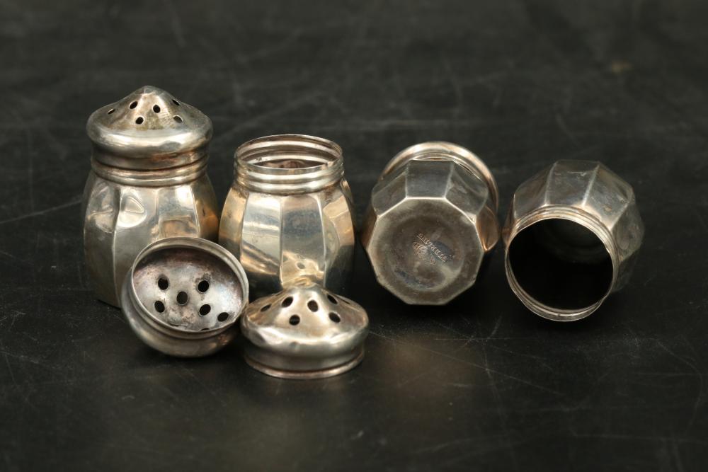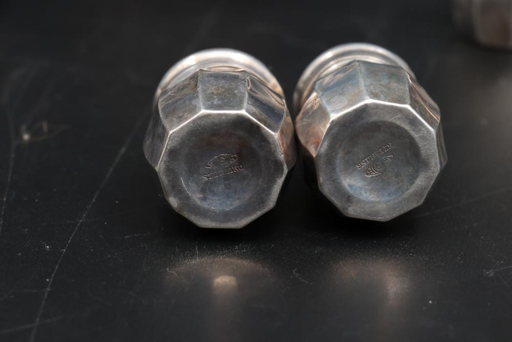 Sterling silver incl gravy pourer, salt and pepper shakers, small filigree style dishes, two small bowls with glass inserts, total weight of sterling items not including glass inserts being 338 grams.