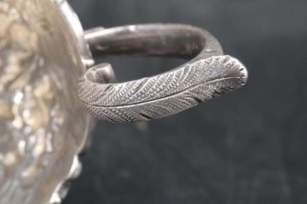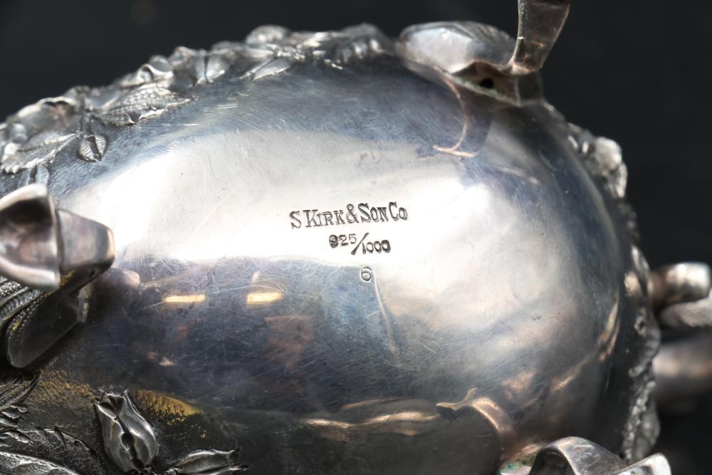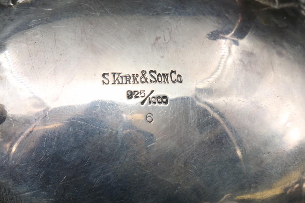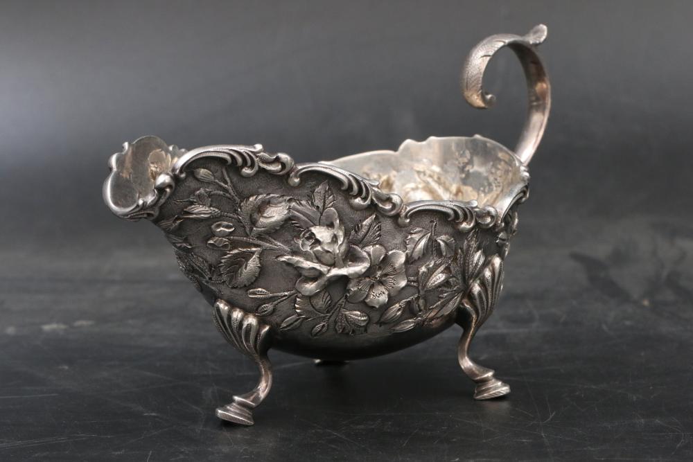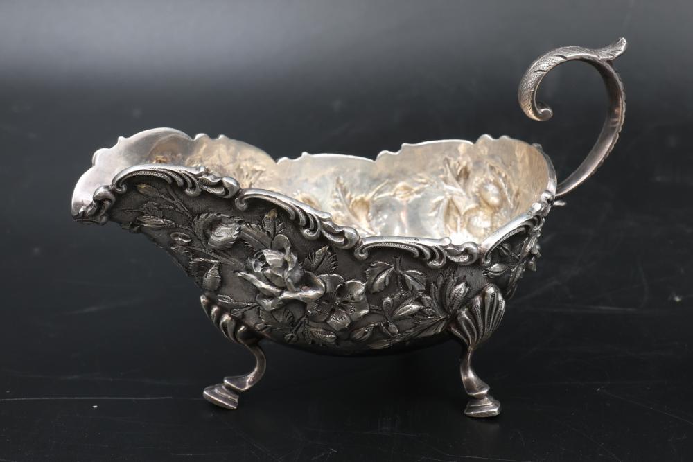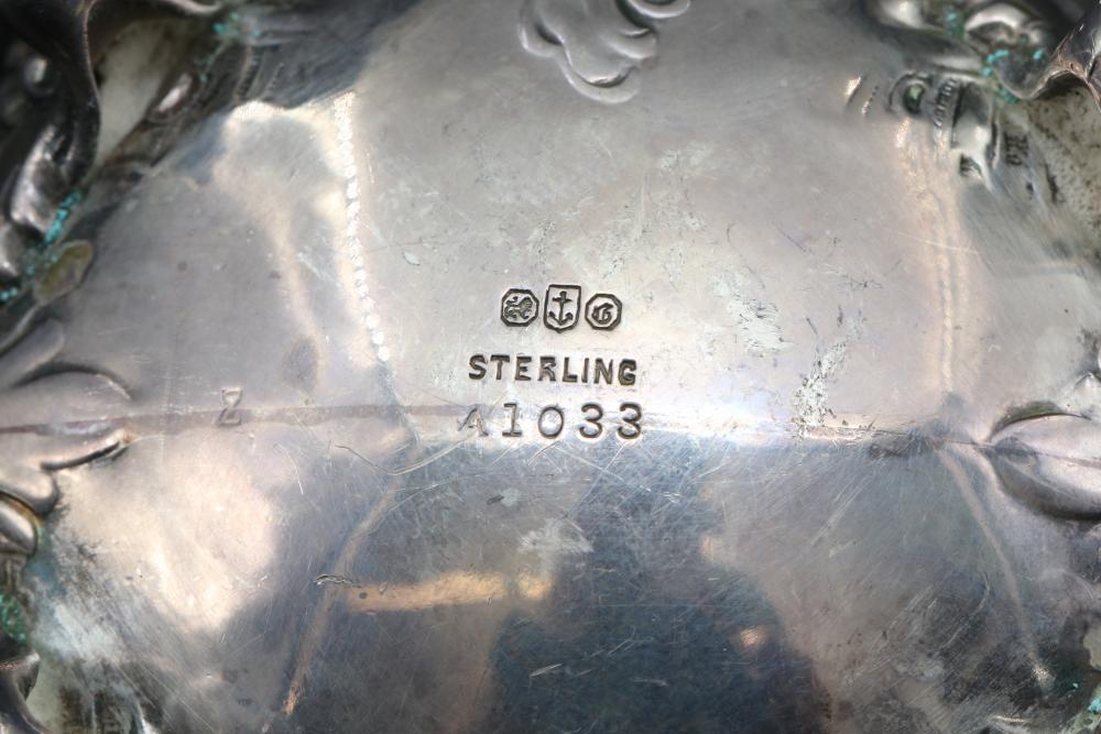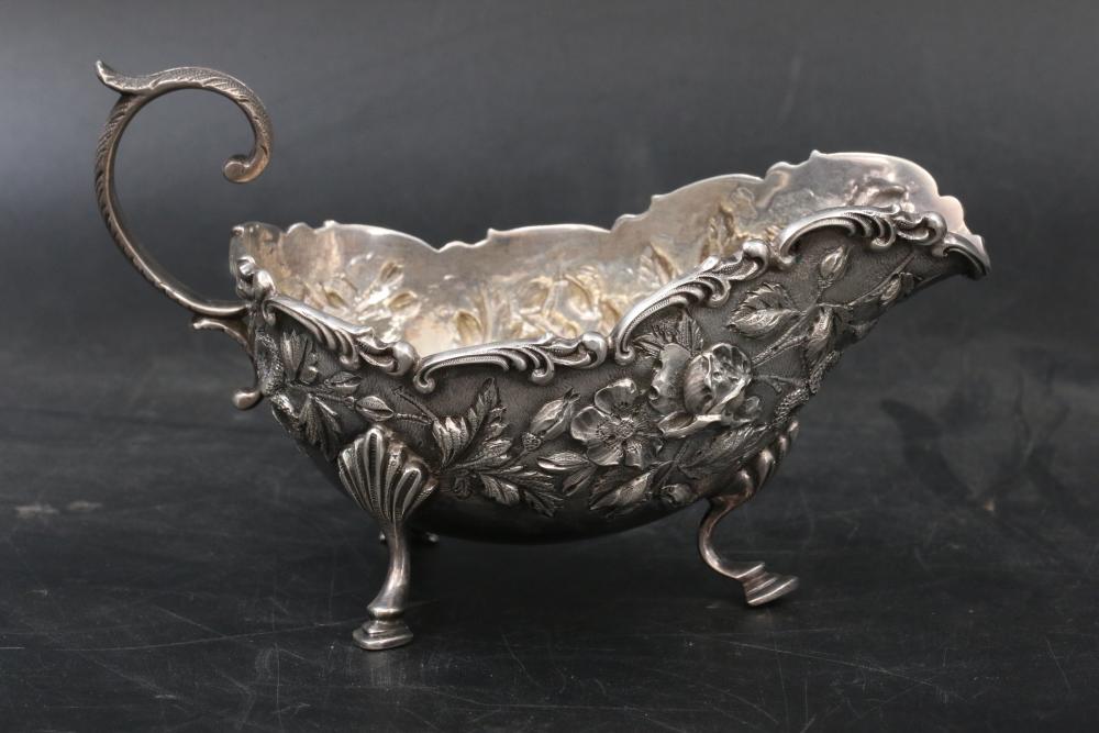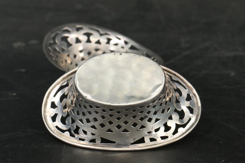 Sterling silver incl gravy pourer, salt and pepper shakers, small filigree style dishes, two small bowls with glass inserts, total weight of sterling items not including glass inserts being 338 grams.