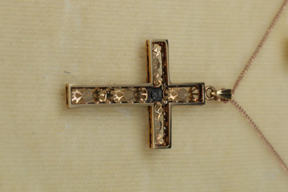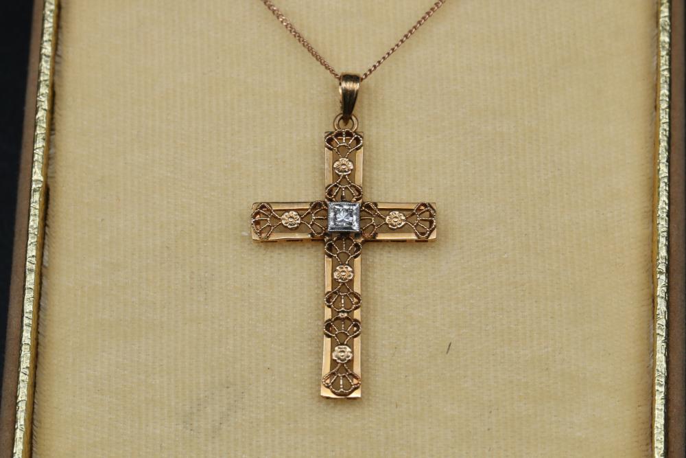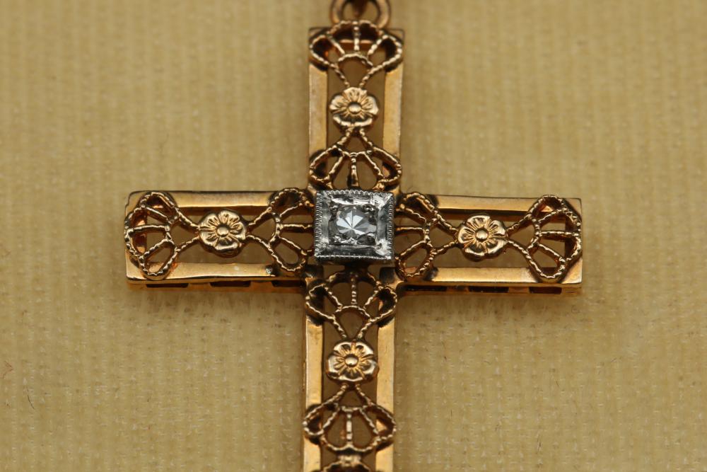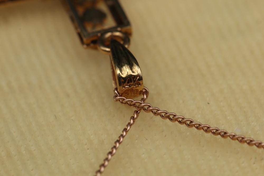 Stamped 14K gold necklace with religious pendant having single diamond in center, total weight being 3 grams.