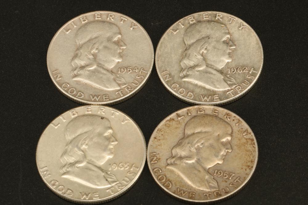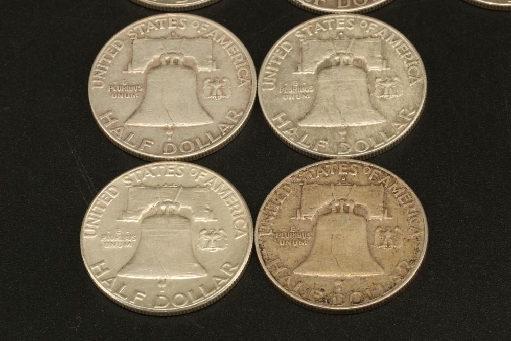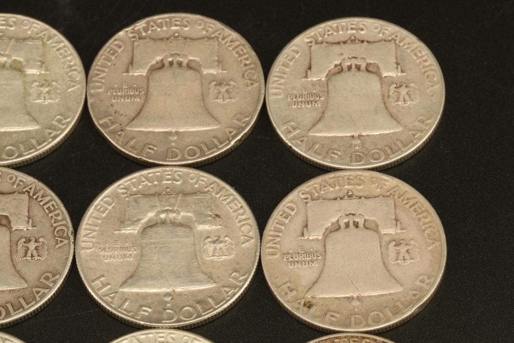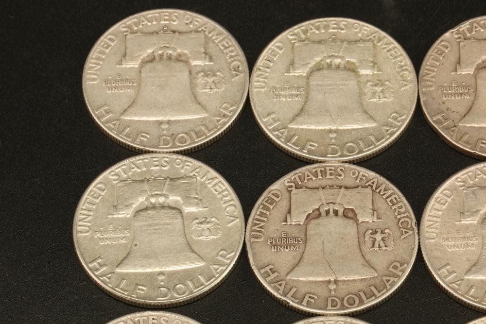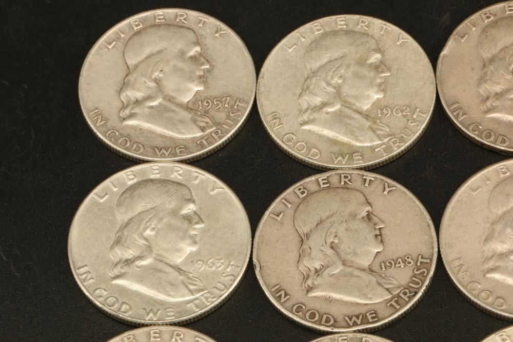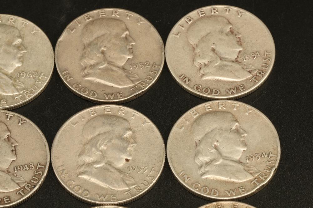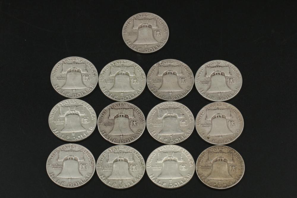 13 Benjamin half dollars, dates incl 1948, 1951, 1952, 1953, 1954, 1957, 1962, 1963.