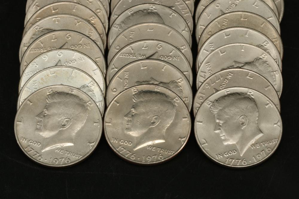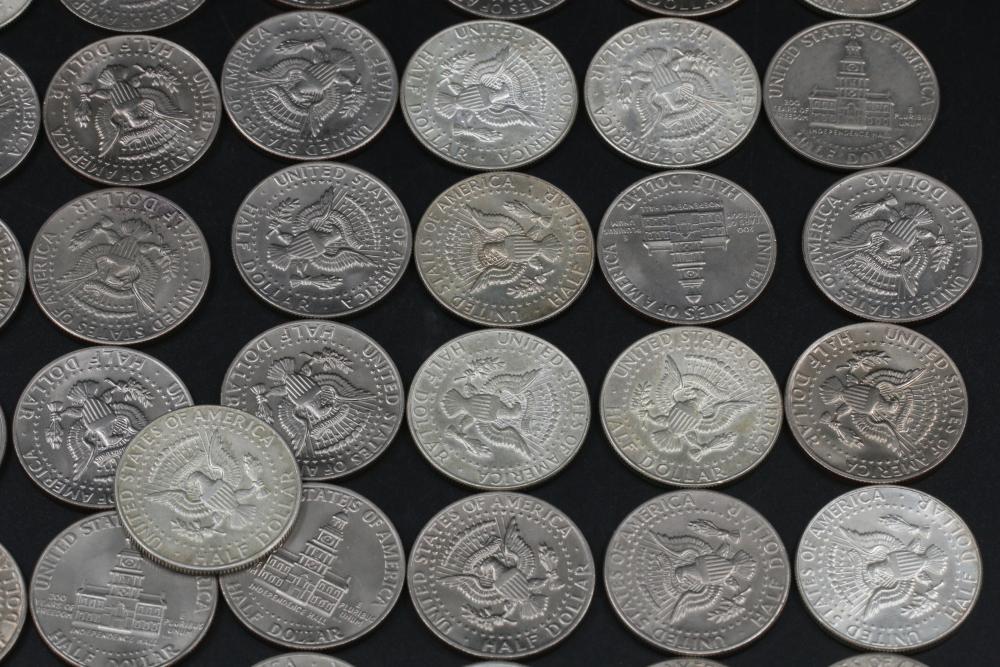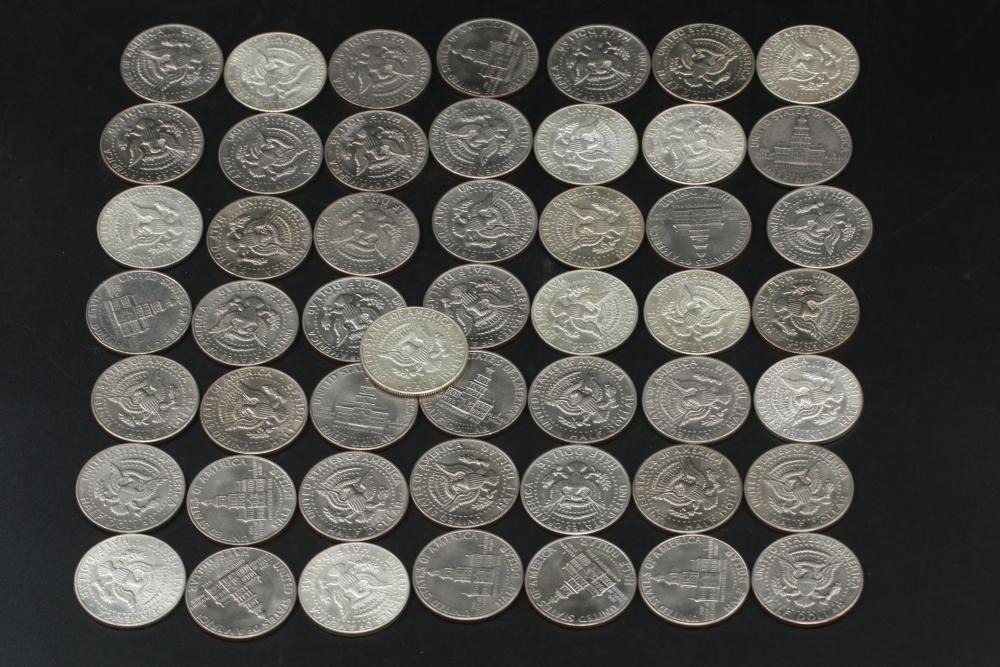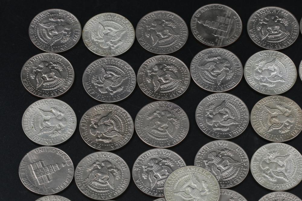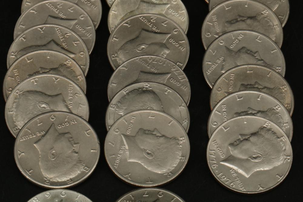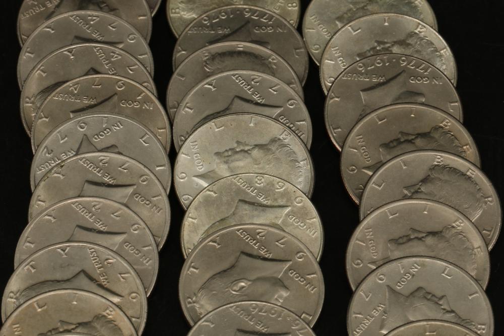 50 half dollar coins, dates incl 1967, 1968, 1969, 1971, 1972, 1974, also incl 10 bicentennial half dollars.