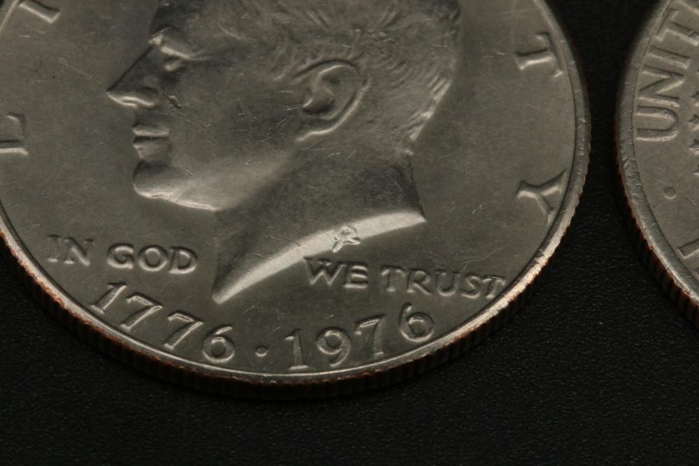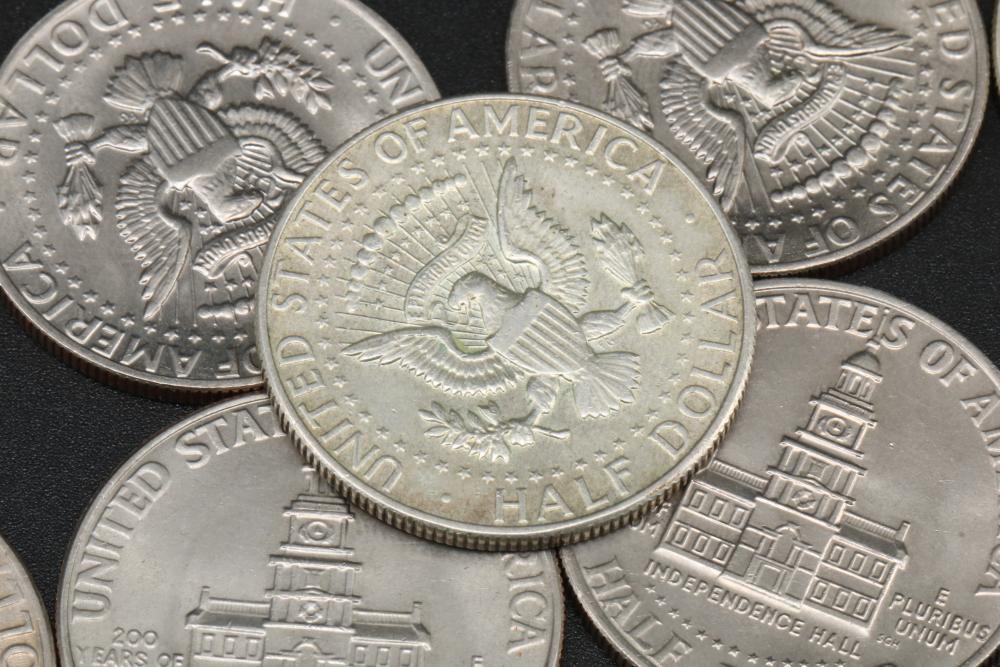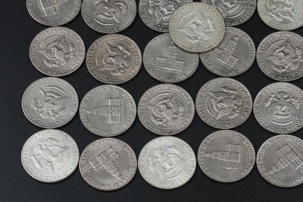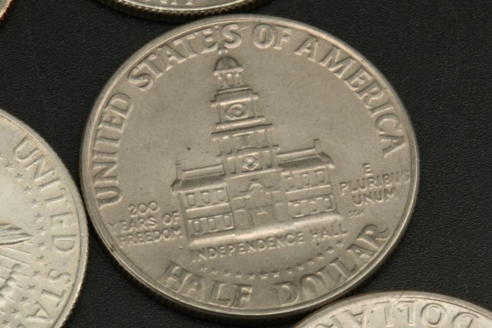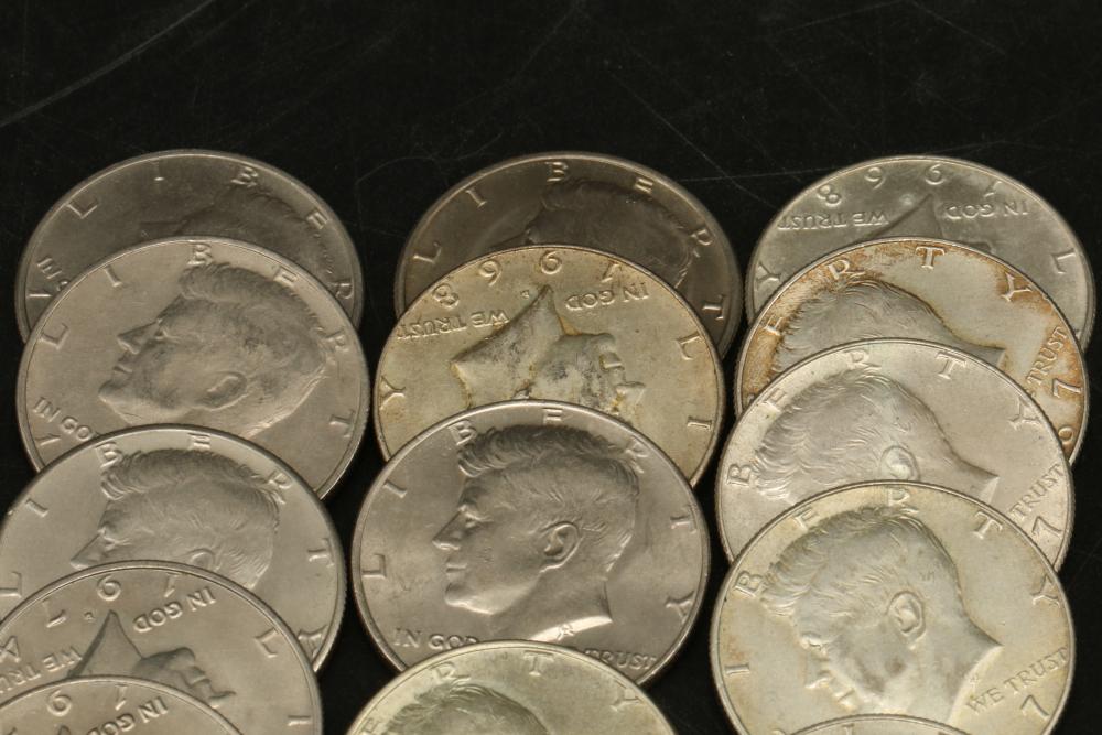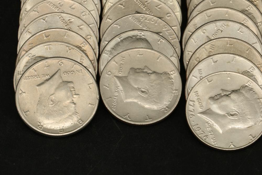 50 half dollar coins, dates incl 1967, 1968, 1969, 1971, 1972, 1974, also incl 10 bicentennial half dollars.
