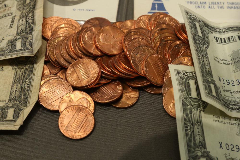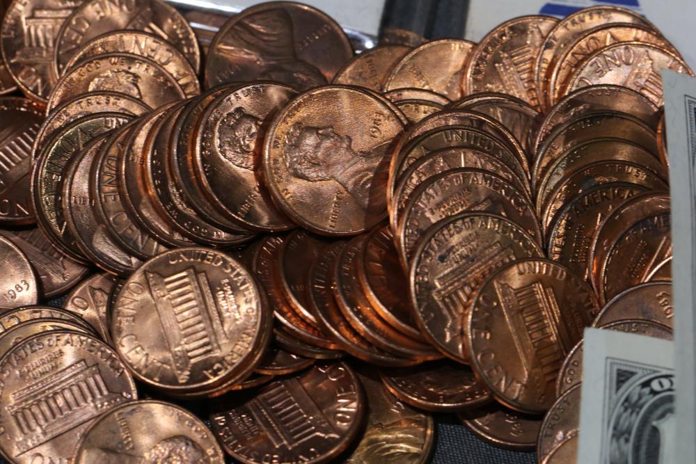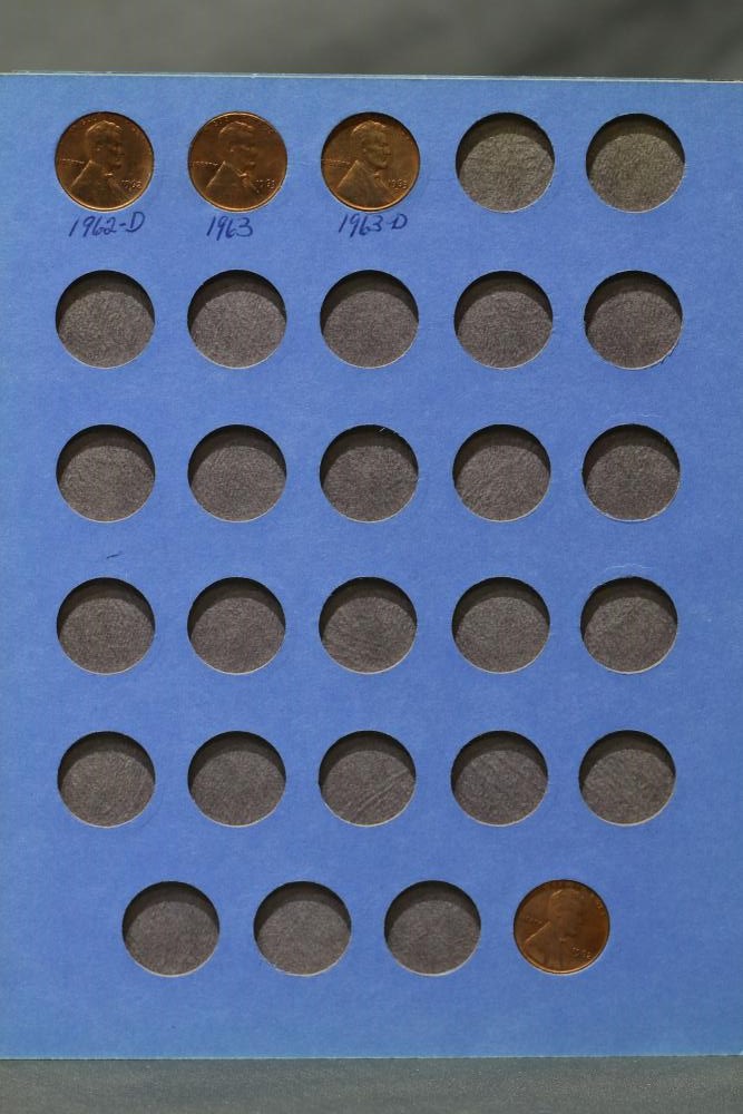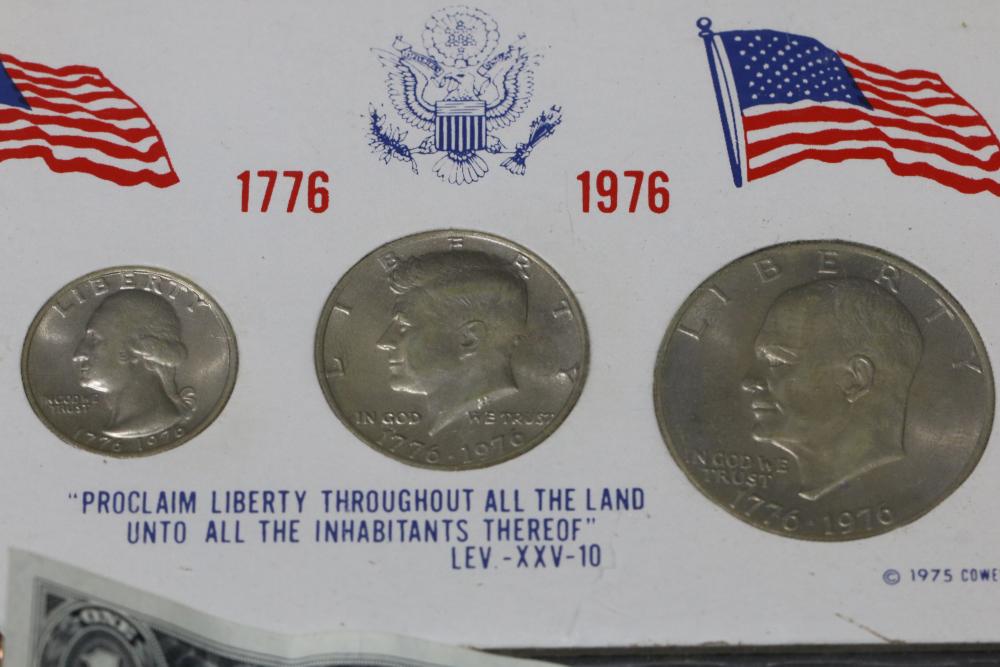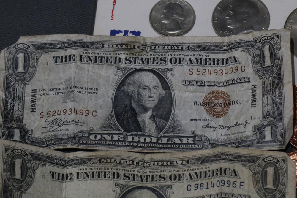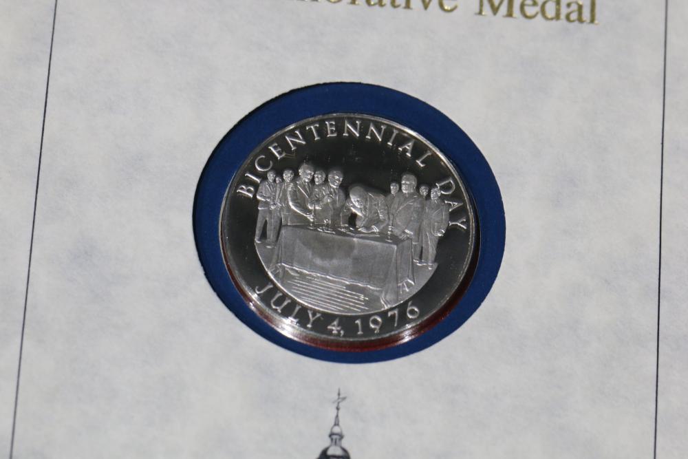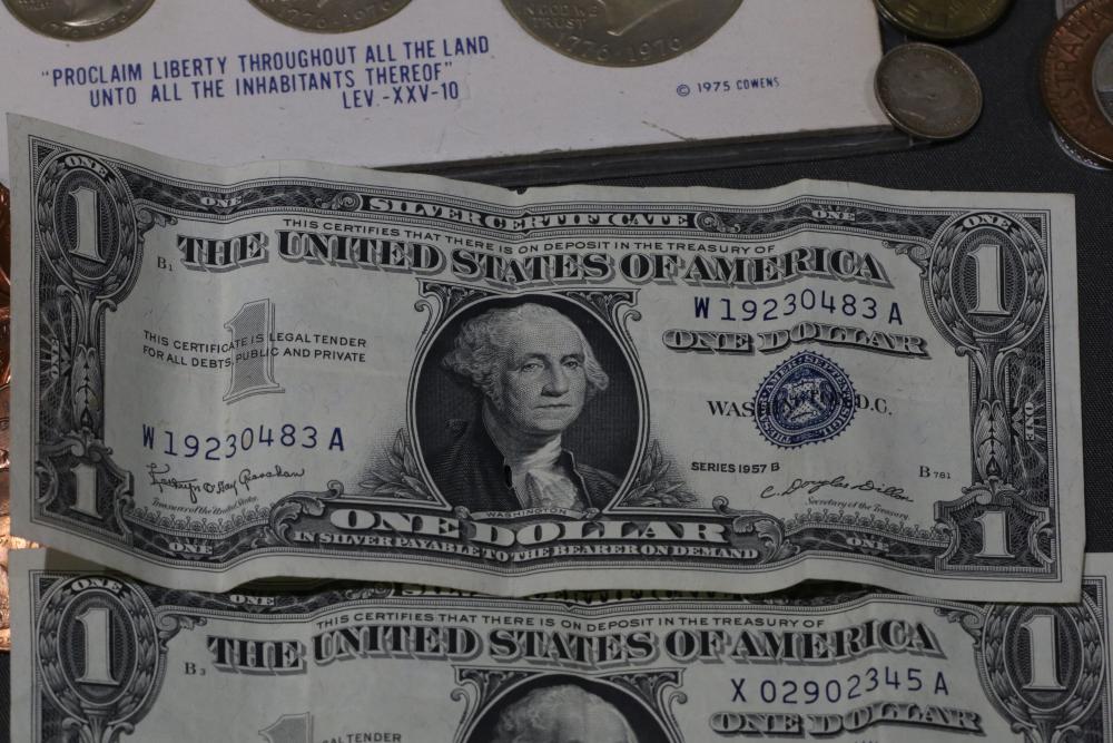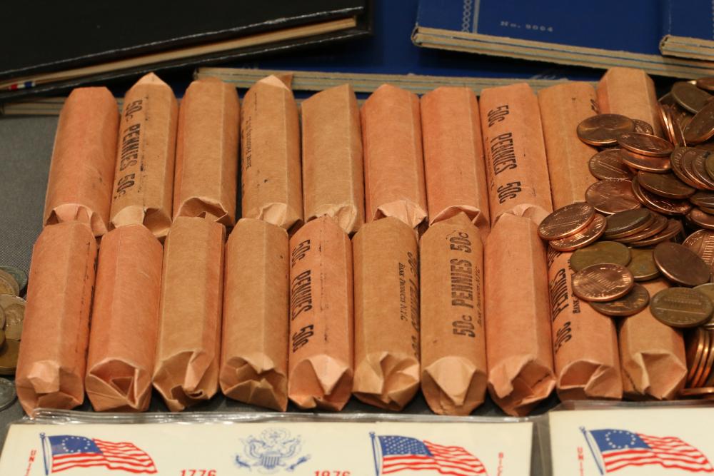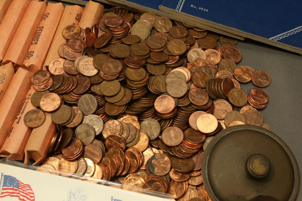 Large grouping of pennies some dates incl 1910, 1912, 1917, 1918, 1920, 1924, 1925, 1927, 1929, 1939, 1940, 1942, 1943, 1944, 1946, 1949, 1950, 1951, 1952, 1953, 1954, 1955, 1956, 1957, 1958, 1959, 1960, 1961, 1962, 1963, 1964, 1965, 1966, 1967, 1968, 1969, 1970, 1971, 1972, 1973, 1974, 1975, 1976, 1977, 1978, 1979, 1980, 1981, 1982, 1983, 1984, 1985, 1986, 1987, 1988, 1989, etc, also incl 20 rolls of pennies, four silver certificates incl one from Hawaii series 1935A, two bicentennial sets including quarter half dollar and silver dollar, The official Bicentennial Day Commemorative Medal sterling silver proof coin, foreign coins and tokens.