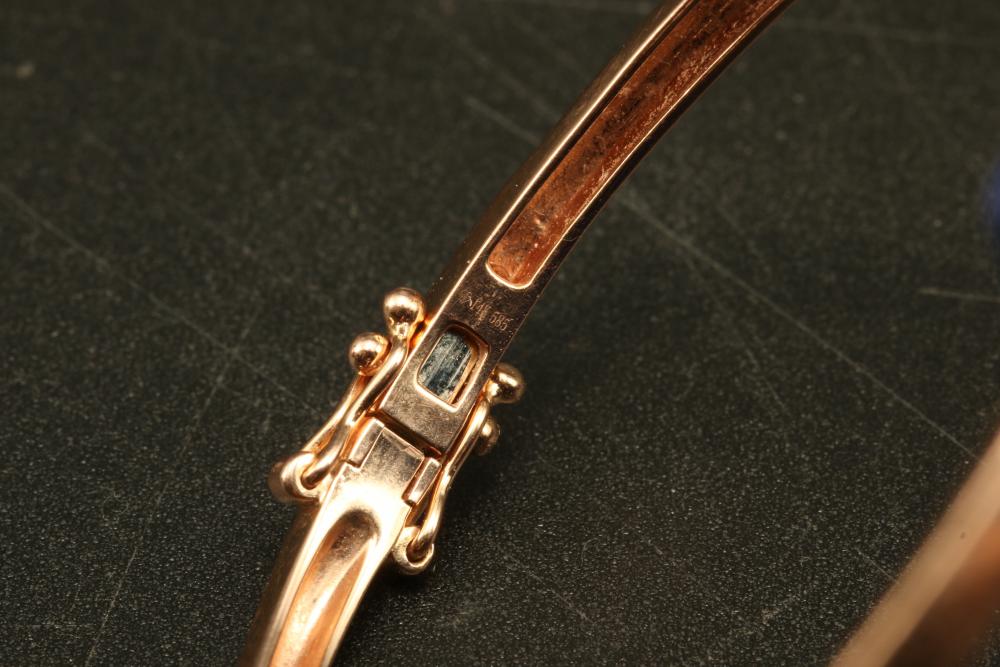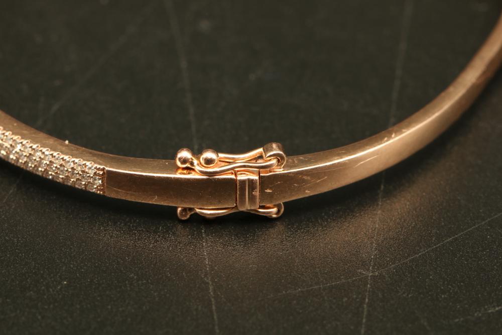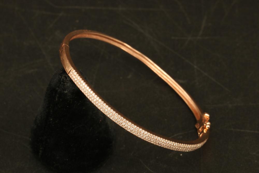 14K stamped rose gold bracelet with many small diamonds, total weight being 9 grams.