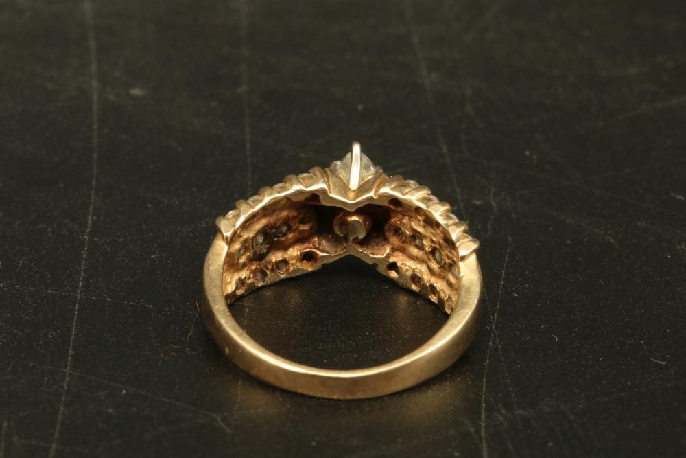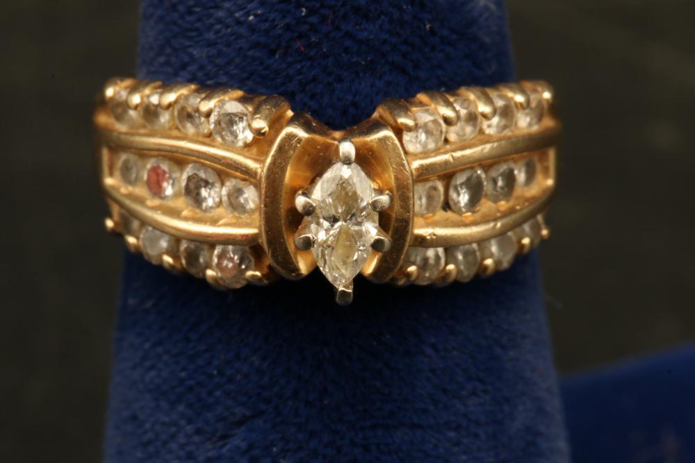 14K gold ring with 24 smaller diamonds on sides and one larger diamond in center, total weight being 5 grams, gold content checked with JSP Testing Solution.